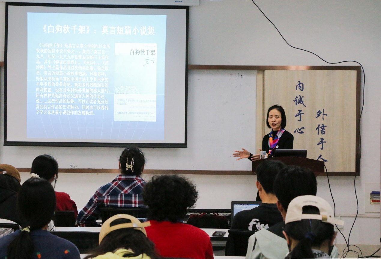 最后,王美春用莫言先生演讲中的一句话为本次报告作结:“我们的文学真能使人类的贪欲,尤其是国家的贪欲有所收敛吗?结论是悲观的。尽管结论是悲观的,但我们不能放弃努力。因为,这不仅仅是救他人,同时也是救自己。”王美春指出,文学最大的作用就是无用之用,文学最有价值之处就是可以给人提供恒久的精神绿洲,可以温柔又安稳地舒缓人的灵魂。王美春鼓励同学们在日常课余时间仔细阅读莫言先生的作品,感悟其中深刻的精神意义。