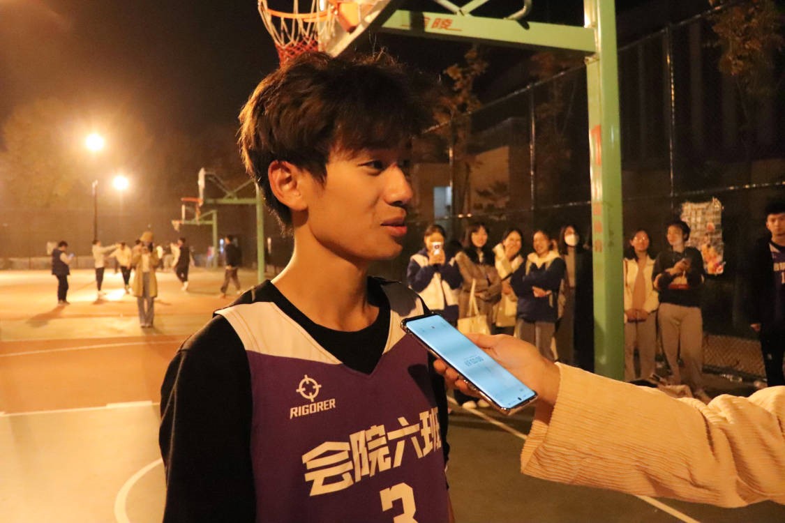 “我印象最深的是会院2103班的11号球员刘齐投中的一个三分球,尽管对方防守严密,但他仍能突破重围,令人感到不可思议,他的防守与进攻也都各有千秋,令我们热血沸腾。”观众席会院2103班胡雪梅同学在采访中说道。