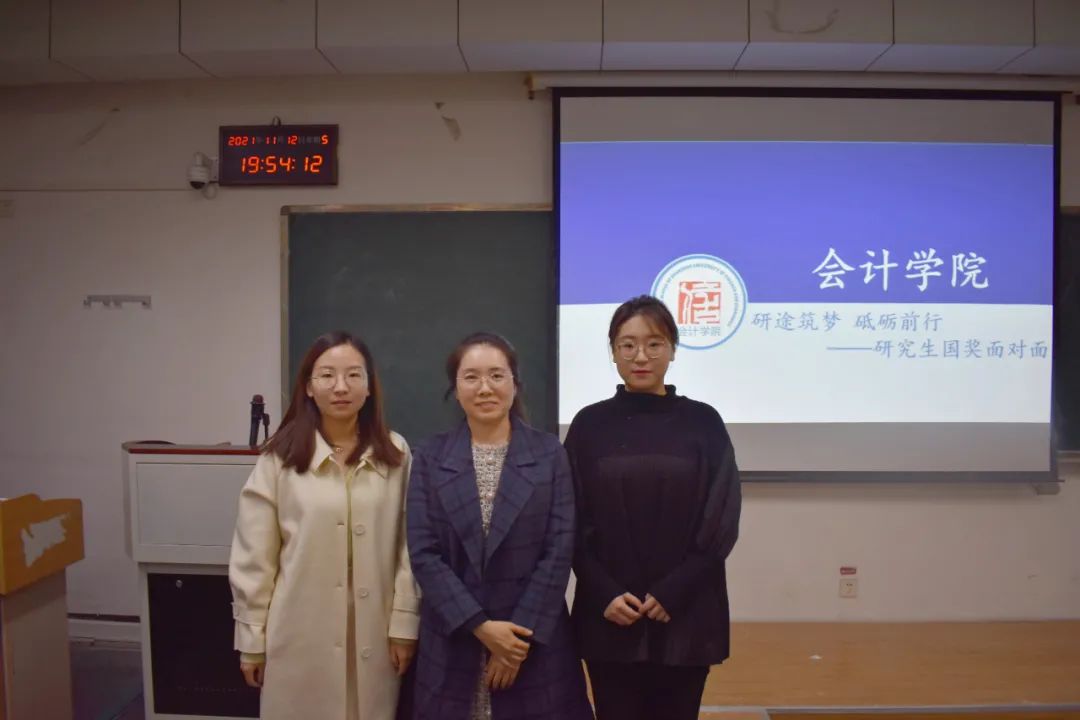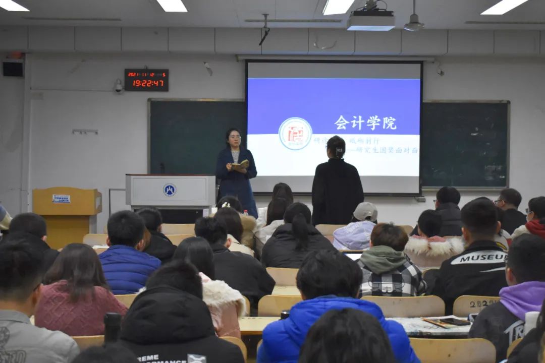 11月12日晚,免费黄色网站 2021年“研究生国奖面对面”活动在燕山校区逸夫楼403教室举行,会计学系主任王斌副教授作为指导专家应邀出席了本次活动。免费黄色网站 2021年国奖获得者亓哲和王晨宇作为主讲人,向参加活动的2021级部分研究生分享了她们研究生学习生活中的精彩经历与宝贵经验。