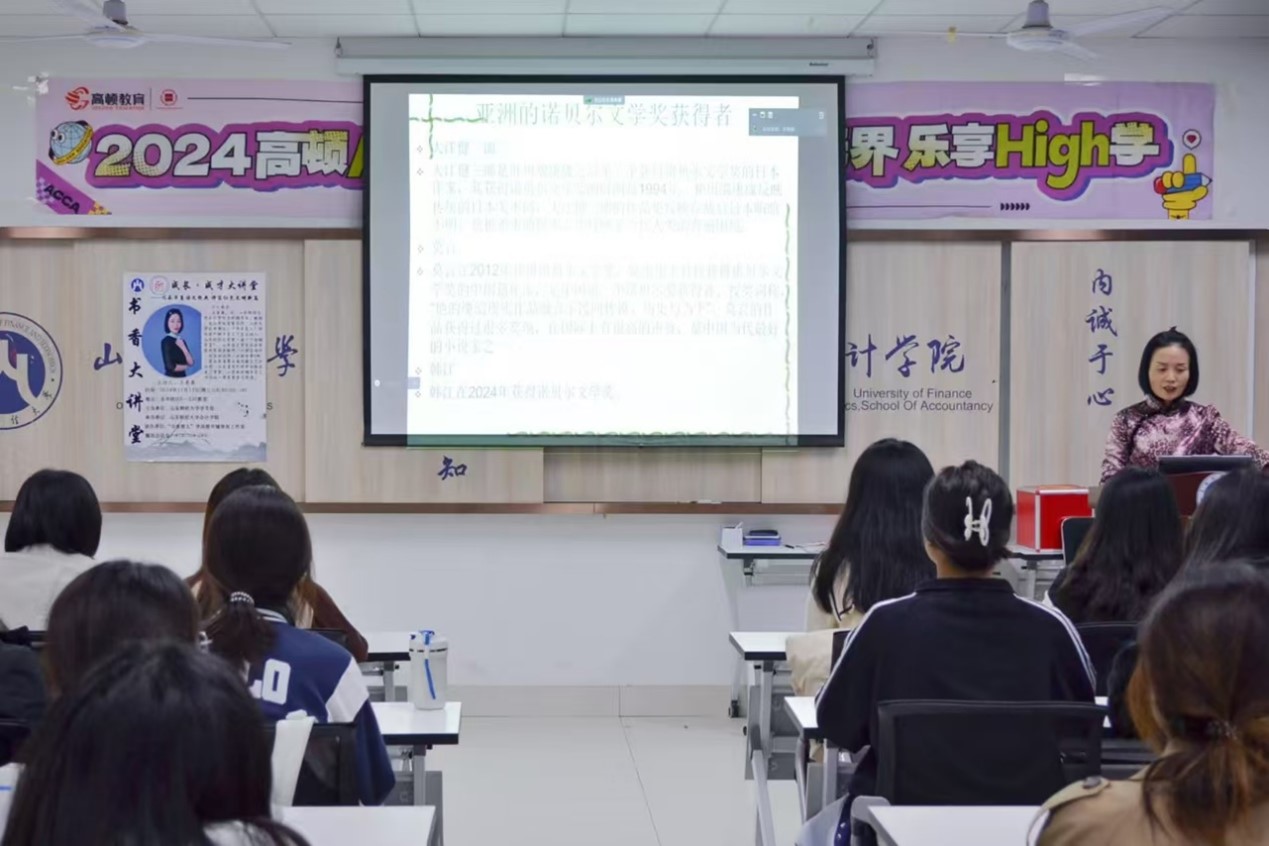 王美春首先概述了基础文学常识,随后聚焦于亚洲诺贝尔文学奖得主,以莫言为例,详细阐述了莫言的创作风格及其对中国文学的影响,并强调了文学价值超越奖项。最后,王美春还鼓励学生利用图书馆等资源,深入阅读经典,传承中华优秀传统文化,展现文化自信。