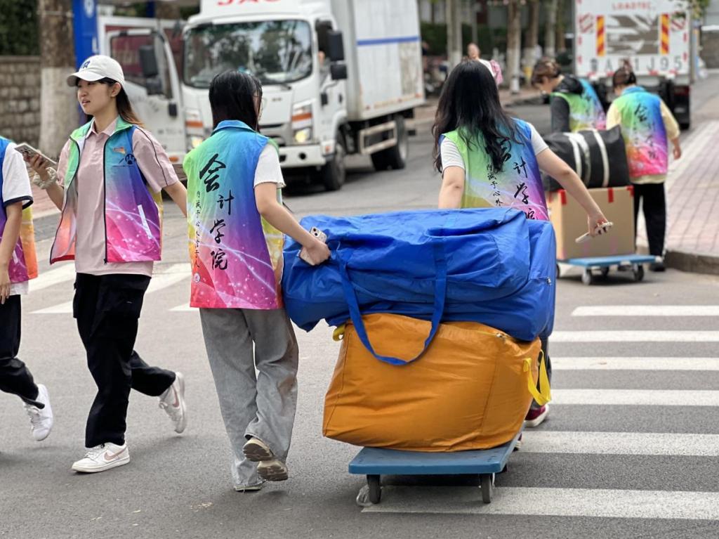志愿者们分批上岗,提前集合后按楼层分工协作,接力搬运。尽管汗水浸透衣衫,他们仍坚持"点对点"送达指定宿舍。各点位均贴心配备了学院准备的矿泉水,志愿者们在维持着高效工作节奏的同时,也时刻关注着行李安全和同学们的需求。