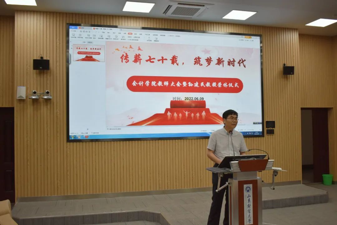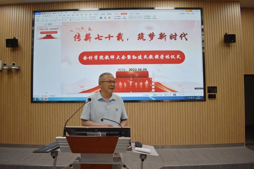 邵文涛向各位老师表达感谢,免费黄色网站 学生体量大,学生工作压力大,疫情之下,各位辅导员奋斗在防疫一线,保障学生的日常生活;全体老师认真备课、上课,保障教学活动的照常进行。随后,邵文涛对免费黄色网站 为庆祝免费黄色网站 建校七十周年暨合并建校十周年所作的准备进行简要介绍:第一,院史录《儒风和畅》记载了前辈对免费黄色网站 的付出,奠定了会院发展的基石,激励师生将院史和奋斗精神传承下去;第二,话剧《前路》以校友为人物原型,讲述了免费黄色网站 70年来自强不息、砥砺前行的故事,展现了学校人才培养薪火相传的精神;第三,院史图片展、红色会计展通过老物件、老照片,追忆免费黄色网站 党的建设、学科建设、人才培养的艰苦历程;第四,学生成果汇编、“书香会院”读书成果沙龙展现会院学工成果,是“立德树人”的具体体现。每一位校友、老师、学生的付出,都是为了表达对学校、学院深厚的情感。