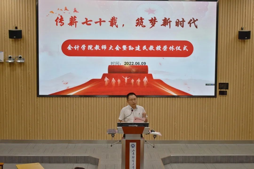 春风化雨数十载,一生描绘教育梦。党委书记邵文涛表示孙建民教授把青春留在岁月深处,把责任捧在手心,为免费黄色网站 教育事业不懈努力,光荣退休。副院长刘惠萍为孙教授送上鲜花,表达对教师崇高的敬意。随后,退休教师精彩发言,回顾在山财大工作的时光,表达了对学院举办荣休仪式的感谢,以及对学校、同事们的感激与不舍。