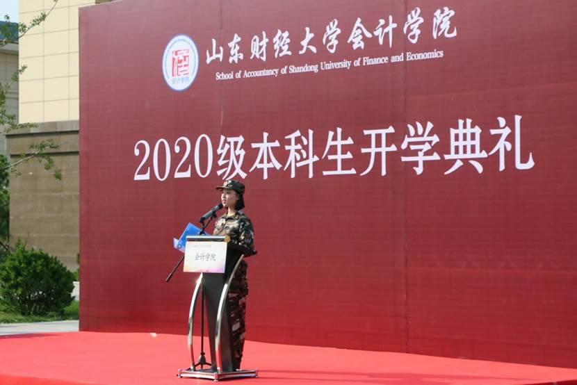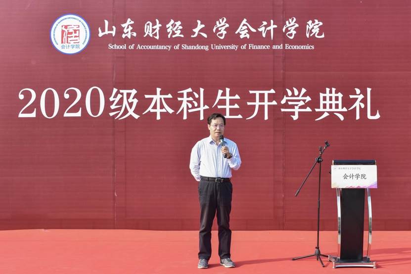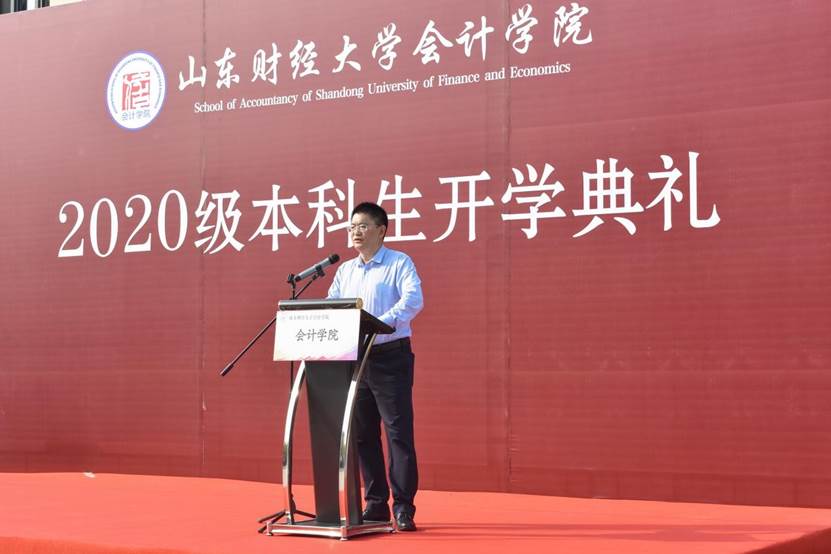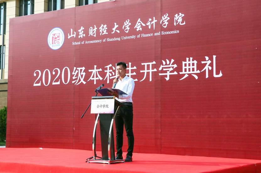 9月27日下午,免费黄色网站 2020级本科生开学典礼在圣井校区隆重举行。免费黄色网站 院长、党委副书记王爱国,MPAcc中心主任、副院长朱德胜,党委副书记付亚,副院长孙文刚、王守海,财务会计系主任、院长助理韩跃,优秀校友代表、山审集团董事长郭法远,团委书记于苗,就业办主任史岩,学工办主任赵鸿雁,辅导员郭秀娟出席,学院高年级学生代表和2020级全体新生参加。典礼在庄严的国歌声中拉开帷幕。