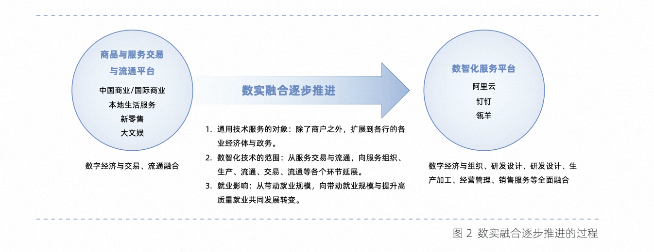 推进数实融合是数字经济发展的主线。国家“十四五”数字经济发展规划明确提出,要促进数字技术向经济社会和产业发展各领域广泛深入渗透,推进数字技术、应用场景和商业模式融合创新。当数字技术向大交通、大能源、大制造、大健康、大金融等行业深度融合时,数字技术的渗透和发展带来了劳动力市场巨大的变化,在数字产业化过程中,由平台、平台上的不同市场经济主体共同建设起了新的就业生态。