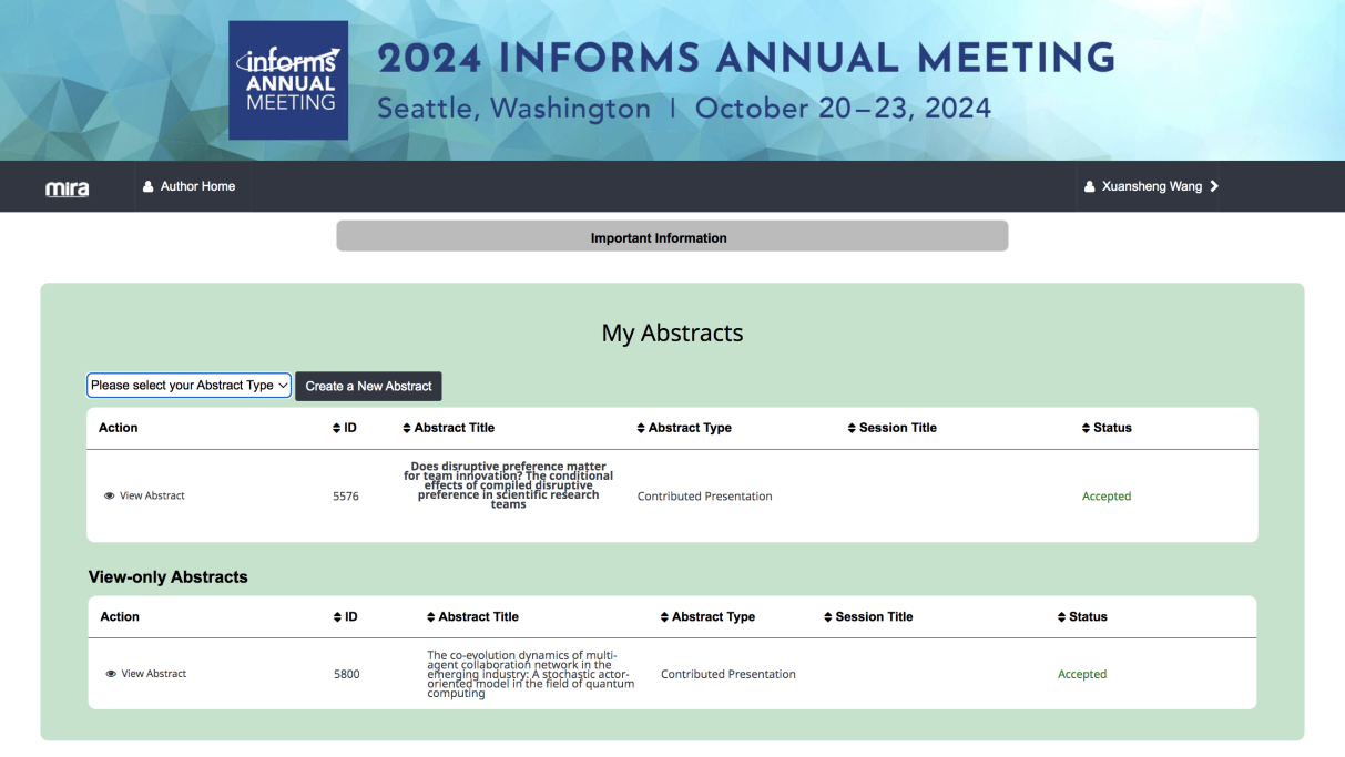 2024年5月,免费黄色网站 本科生马英杰、王轩晟、杨启晗、柳智炀、刘佳合作撰写主题为“创新合作网络拓扑结构的动态演化趋势及其驱动机制分析”“团队成员的颠覆性创新偏好如何交互作用于团队创新”的两篇论文,相关成果同时被2024年运筹与管理科学年会(2024 INFORMS Annual Meeting,以下简称INFORMS年会)接收,陈力凡副教授为指导老师。