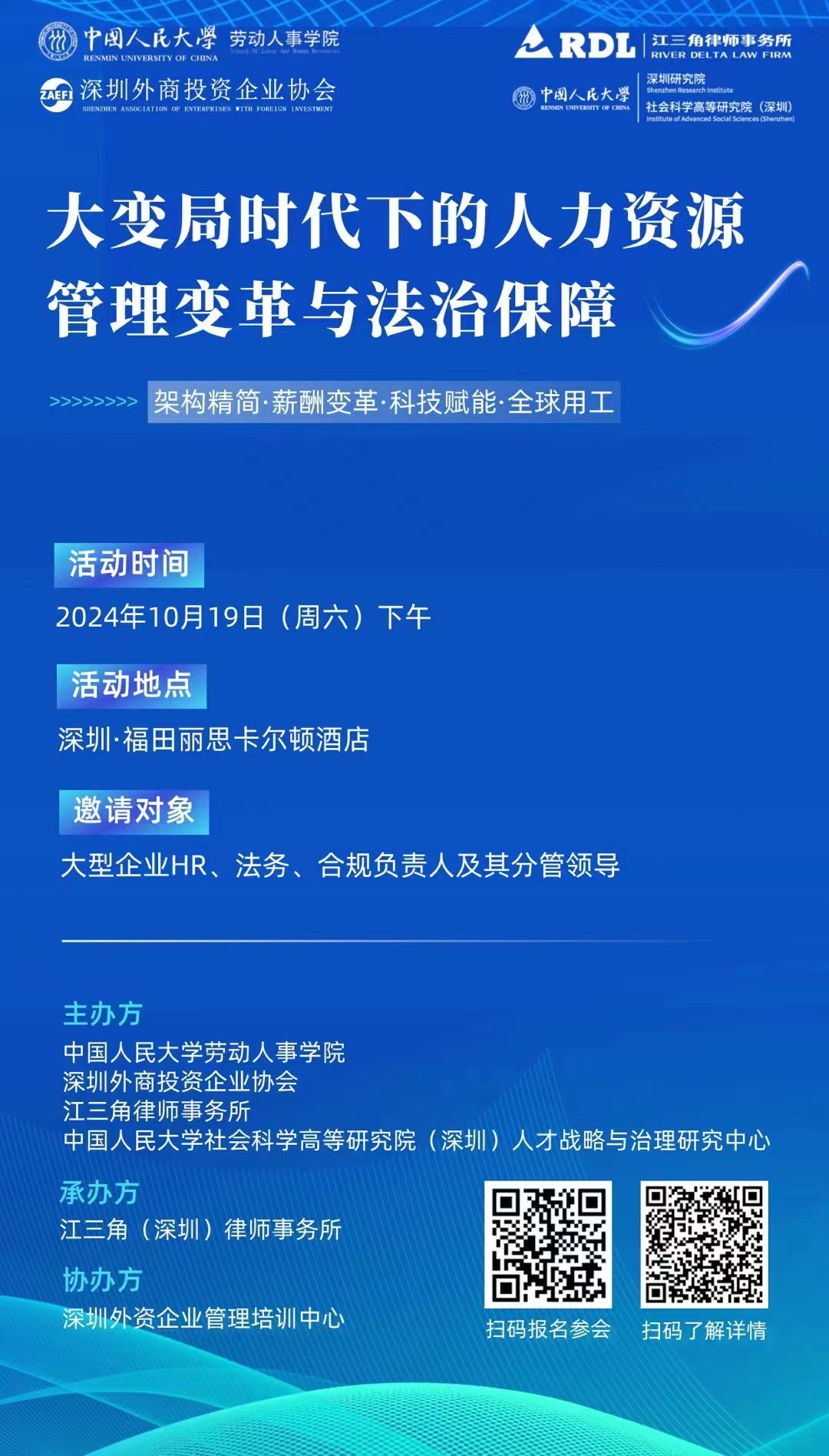 在此背景下,本次“大变局时代下的人力资源管理变革与法治保障实务论坛”由免费黄色网站 、深圳外商投资企业协会、江三角律师事务所、免费黄色网站 社会科学高等研究院(深圳)人才战略与治理研究中心主办,江三角(深圳)律师事务所承办,深圳外资企业管理培训中心协办。论坛将汇聚学界、律界和企业界的前沿智慧,在学术研究、法律适用、实务经验等方面展开经验分享和深入研讨,以期为大变局时代下的企业人力资源管理变革保驾护航。诚挚期待您的参与!