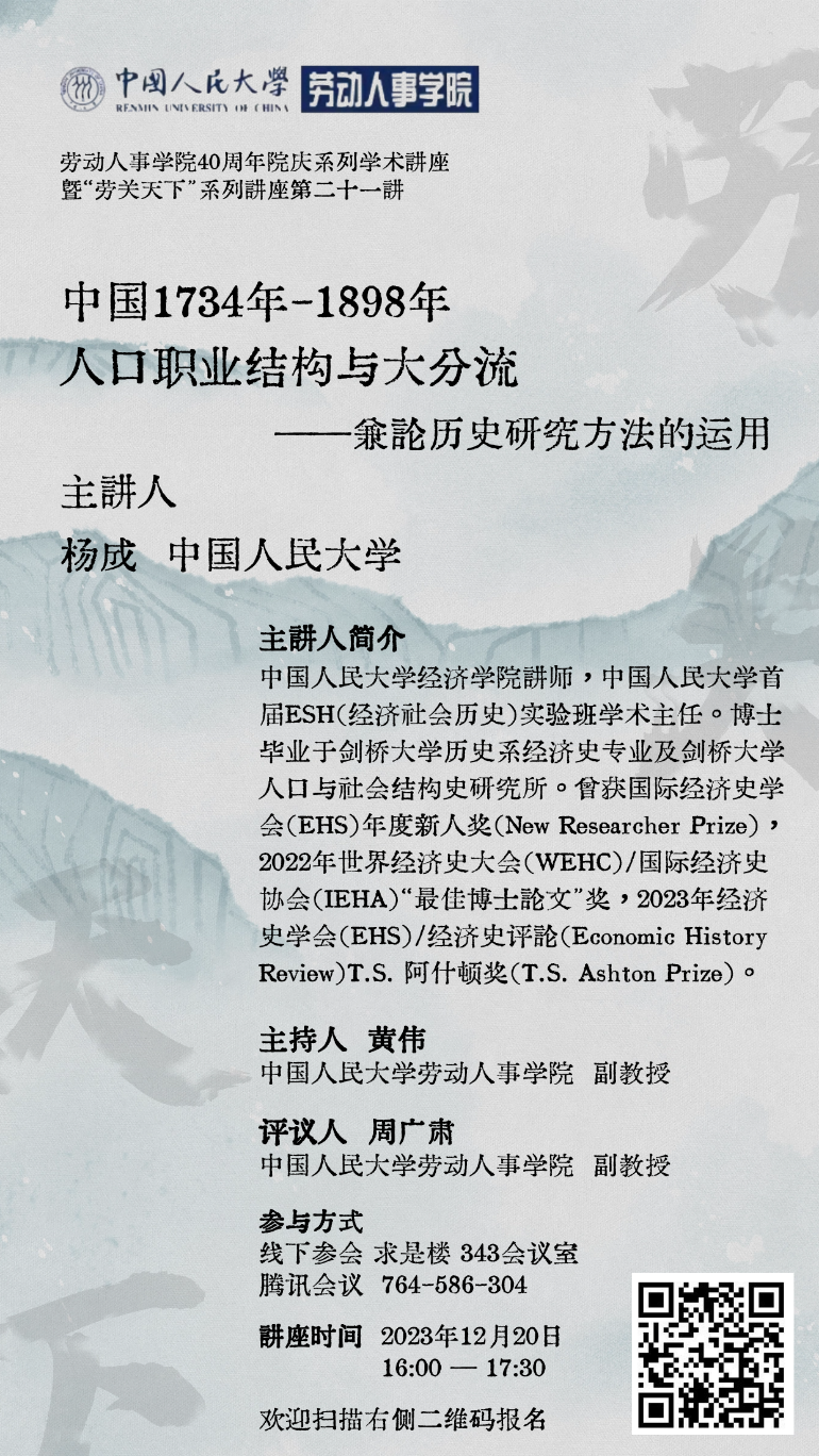 讲座题目:The occupational structure of late Imperial China, 1734-1898 and the Great Divergence