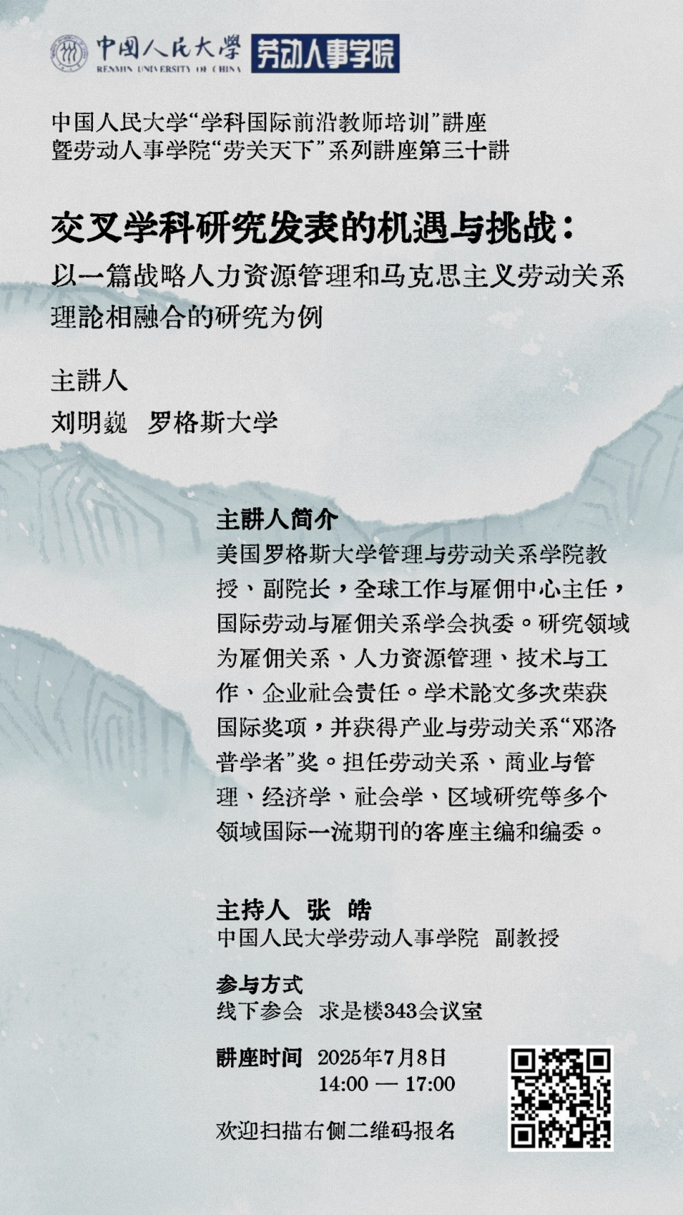 刘明巍,美国罗格斯大学管理与劳动关系免费黄色网站 教授、副院长,全球工作与雇佣中心主任,国际劳动与雇佣关系学会执委。研究领域为雇佣关系、人力资源管理、技术与工作、企业社会责任。学术论文多次荣获国际奖项,并获得产业与劳动关系“邓洛普学者”奖。担任劳动关系、商业与管理、经济学、社会学、区域研究等多个领域国际一流期刊的客座主编和编委。