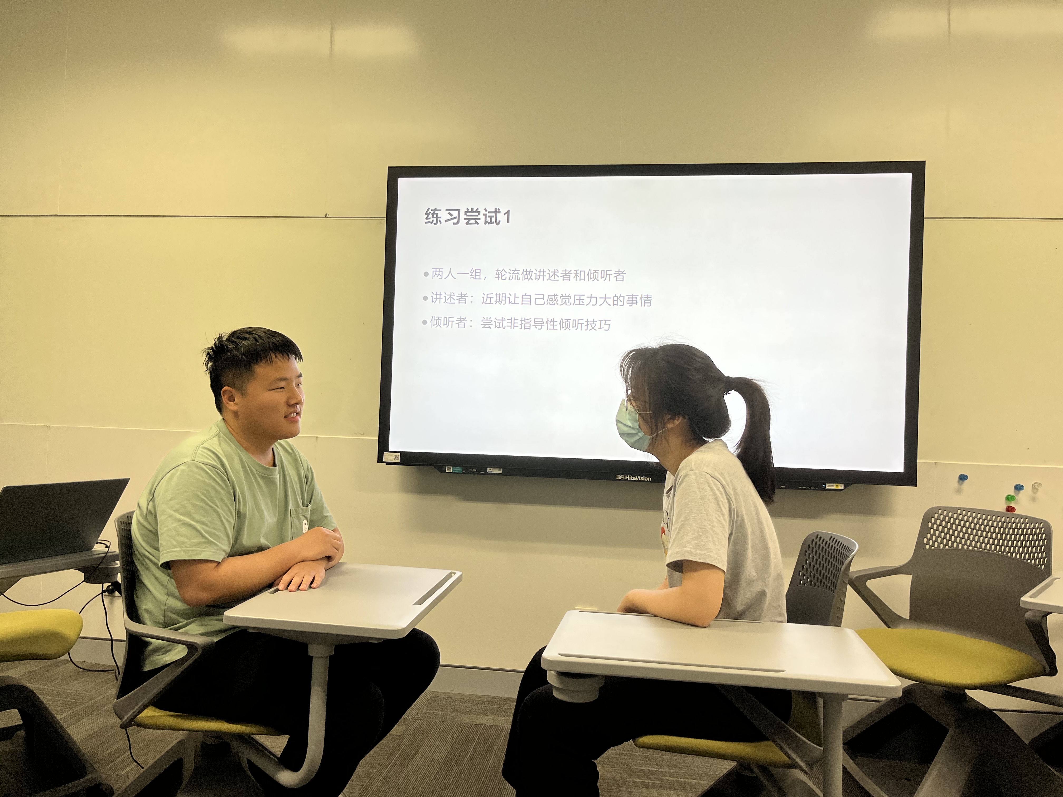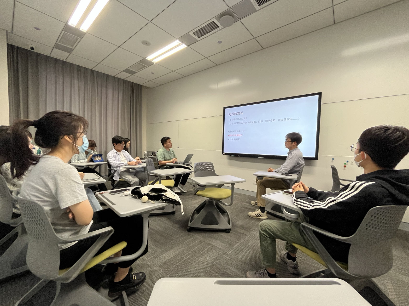 王鸿飞依次讲解了非指导性倾听和共情的概念和基本技术,并组织在场辅导员以两人小组为单位进行体验式训练。各小组依次扮演讲述者和倾听者,将非指导性倾听和共情技术融入其中。在分组训练后,部分辅导员代表在台前再次开展模拟,并分享自己在扮演讲述者和倾听者时的切身感受。