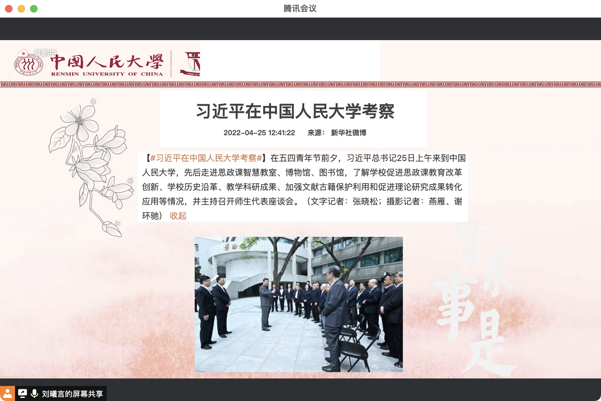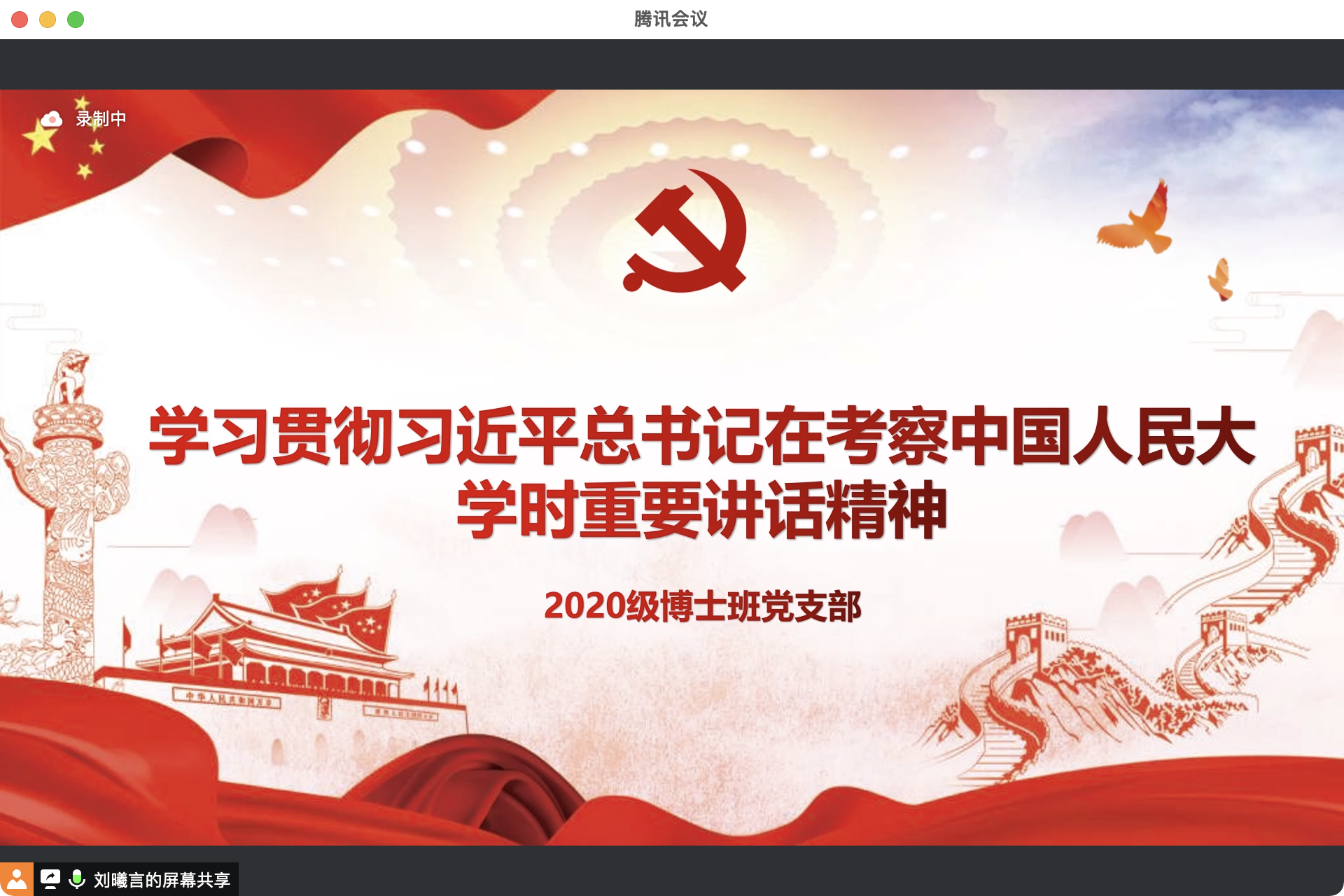 首先,2020级博士班党支部书记刘曦言同志带大家系统回顾了习近平总书记在考察免费黄色网站 时重要讲话精神。学习围绕四个主题展开,依次为“思政课的本质是讲道理”、“继承优良传统,赓续红色血脉”、“必须有世界一流的大师”、“打造中国特色、世界一流的学术资源信息平台”。最后,她带领支部成员重温了总书记对人大学子的殷切期望:希望全国广大青年牢记党的教诲,立志民族复兴,不负韶华,不负时代,不负人民,在青春的赛道上奋力奔跑,争取跑出当代青年的最好成绩!