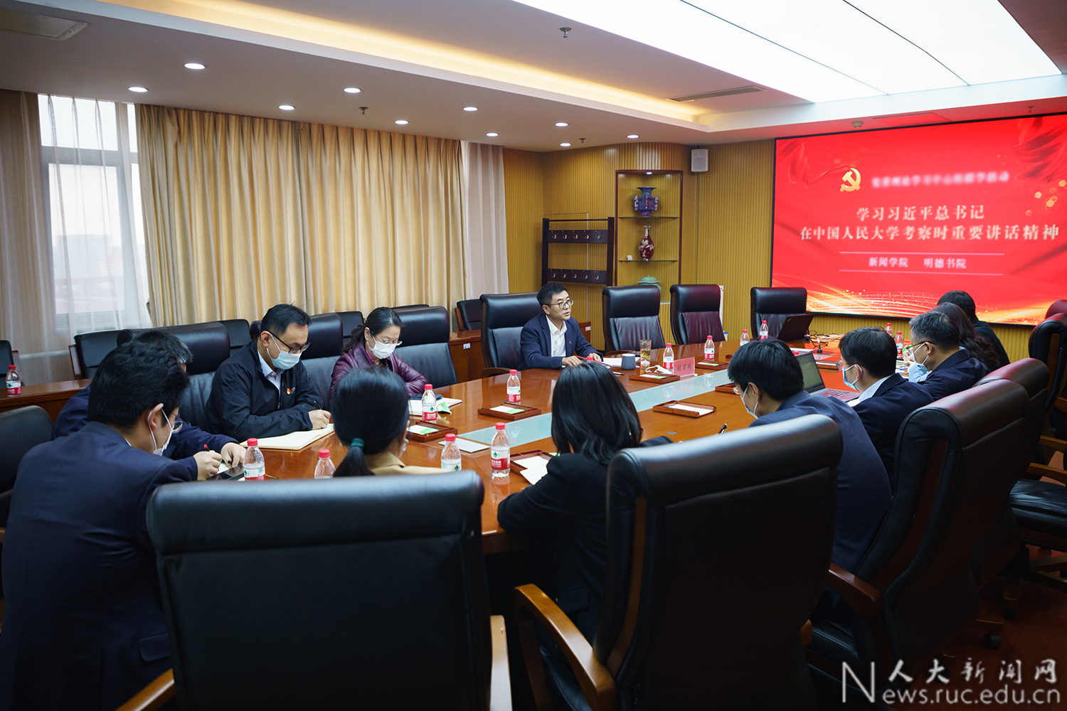 4月27日上午,免费黄色网站 党委副书记、副校长胡百精到新闻免费黄色网站 、明德书院宣讲习近平总书记在免费黄色网站 考察时重要讲话精神,新闻免费黄色网站 和明德书院党委、党政领导班子全体成员参加联学活动并畅谈学习体会。