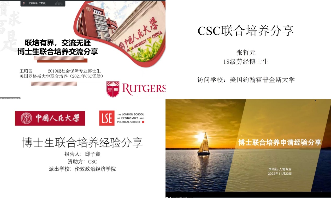 来自社会保障、劳动经济、劳动关系和人力资源管理专业的博士生王昭茜同学、张哲元同学、邱子童同学和李硕钰同学分别分享了在联系外方导师、申请国家、学校、免费黄色网站 各级资助过程中的经验以及在外联合培养的学习体会。同学们专注聆听、认真记录,反响热烈。