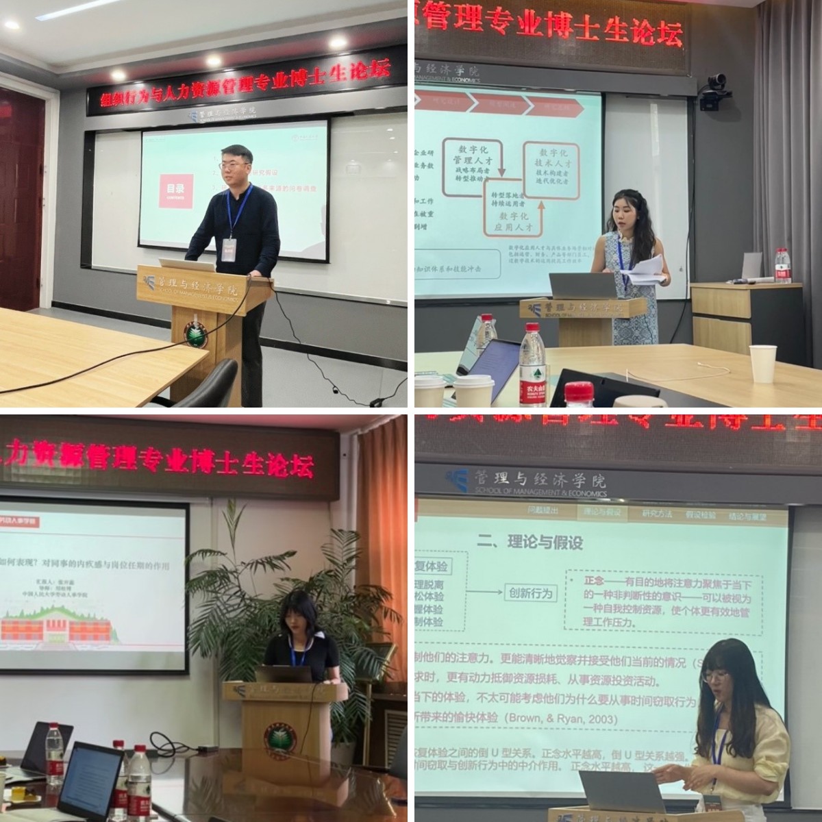 本次论坛共分为“职业生涯开发与管理”、“数字人力资源与创新”、“个体态度行为与特质”三个博士生论文分会场。在职业生涯开发与管理分会场上,免费黄色网站博士生梁荣成分享了中国企业家的素质模型和组织将帅的使命驱动;博士生程进凯从内隐理论讨论了一致性对领导动机和领导力涌现的影响;博士生白彦从“自我”和“关系”视角探讨了员工晋升前景对离职意向的影响;博士生王丹阳从结构主义视角研究了国有科技型企业人才激励机制。在数字人力资源与创新分会场上,免费黄色网站博士生骆冬嬴从追随力视角讨论了员工创新形成机制;博士生李壁琪分享了基于文献计量法总结的平台算法控制研究现状;张晓雅同学基于案例和问卷方法构建了数字化应用人才胜任力模型;博士生杨春梦从社会现象出发研究了时间窃取对创新的影响。在个体态度行为与特质分会场上,博士生张开蕊从情绪视角探究了资质不足的员工在工作场所的表现;博士生王哲源讨论了后疫情时代下外派员工适应问题。