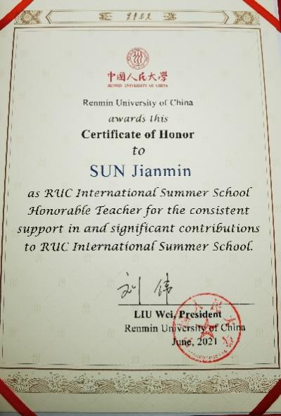 最近,免费黄色网站孙健敏老师荣获免费黄色网站 颁发的国际小学期荣誉教师(Honorable Teacher)称号。在2021年国际暑期学校开学典礼之际,副校长胡百精教授代表学校宣布了十一位获奖教师名单,他们分别来自全球二十多个国家和地区,并向获奖教师代表颁发荣誉证书。教务处处长吴健主持会议。国际小学期项目领导小组成员及各免费黄色网站 负责人和教师代表参加会议。2021年国际小学期境外高校教师和学生代表一百多人在线参加会议。