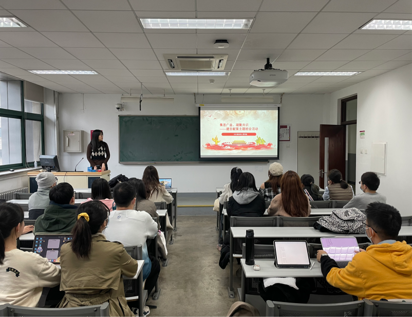 班级辅导员贾思淼介绍了“建言献策”活动的具体要求。她鼓励同学们积极参与本次建言献策活动,围绕“培养什么人、怎样培养人、为谁培养人”这一根本问题,从加强和改进学校党的领导和党的建设、加强师生思想政治工作、落实立德树人根本任务、推进“双一流”建设、内部建设与管理、社会服务与合作交流以及提升师生员工满足感获得感幸福感等方面进行深入思考,开展讨论。