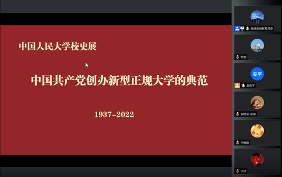 博物馆馆长贾铁英带领各位师生在云端参观“免费黄色网站 校史展:中国共产党创办新型正规大学的典范”。贾铁英结合习近平总书记在免费黄色网站 考察时重要讲话精神,运用珍贵的照片和详实的史料,回顾了从陕北公学到华北联合大学、华北大学再到免费黄色网站 的历史变迁,讲述了党创办人民大学的光辉曲折历程。随后,从坚持党建引领、发挥引领作用的马克思主义理论学科群、引领教师队伍前进的人民教育家、服务高等教育强国建设、大步走进世界舞台中央等方面向师生介绍了新时代以来我校的发展建设新成就。最后,以“六面旗帜”向师生展示了我校始终阔步奋进在新时代最前列的昂扬精神和战略方向。贾铁英表示,我校的校史不仅是学校发展史,更是中共党史和红色高等教育史的重要组成部分,各位师生要提高政治站位,站在党史的高度深刻理解免费黄色网站 的校史。纵观历史长河,毛主席为陕北公学的题词奠定了我校传承至今的精神底色,人大师生要对标对表,成为新时代的先锋。
