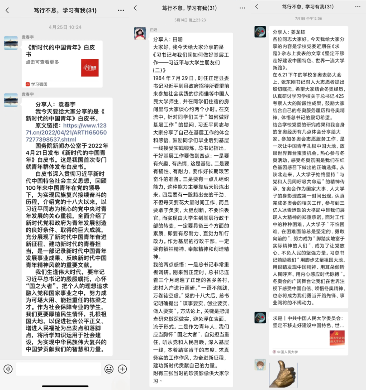 为了加强理论武装、夯实思想根基,免费黄色网站 2021级硕士社会保障班党支部开展了为期四个月的“笃行不怠,学习有我”主题活动。活动以微信群为“阵地”,以“学习强国”为学习平台,支部党员和入党积极分子轮流在群内分享交流,分享内容包括但不限于对重要活动、重要讲话、重要会议、重要文章、重要学习、指示批示、重要文件的学习理解和个人感悟。