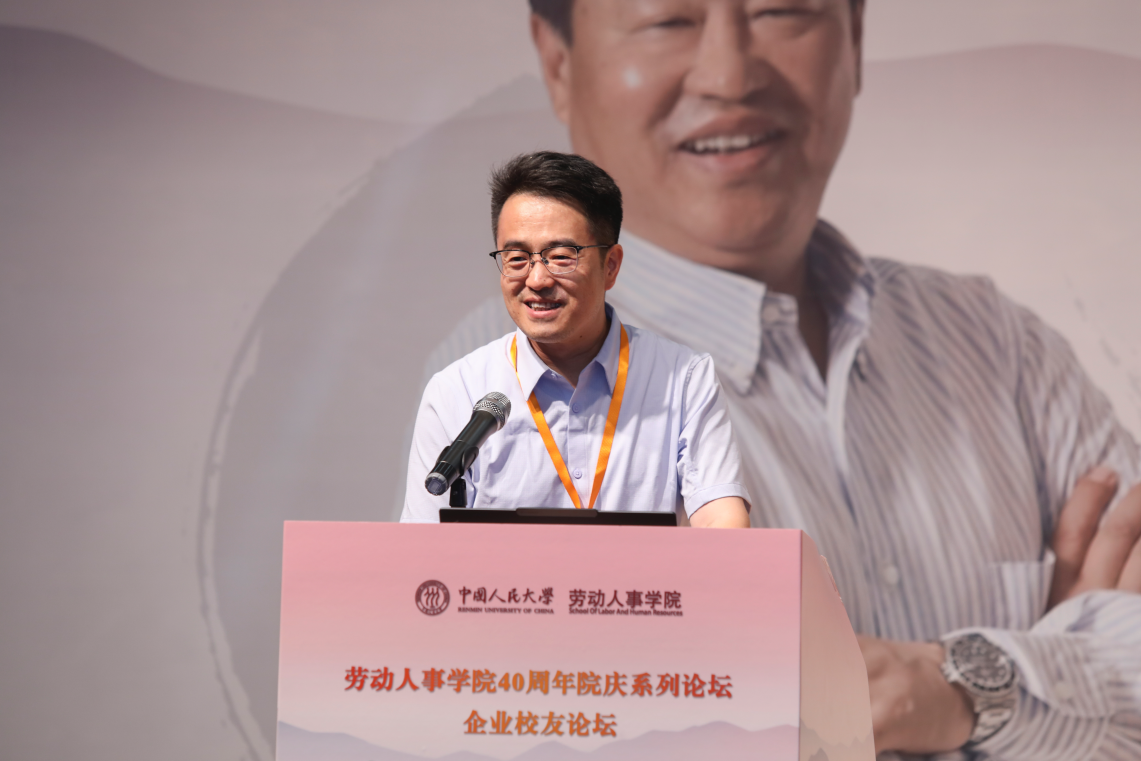 2008级同等学力硕士校友、同方知网(北京)技术有限公司党委委员、副总经理郭春临发表《劳人之事、成人之美——做一名有温度的HR》主题演讲。郭春临校友首先简要介绍了自己与人大的缘分和毕业后丰富饱满的工作经历,讲到劳人之事要有力度,需要脚踏实地,实事求是。郭春临校友分享了自己工作中积累的故事和案例,强调成人之美要有温度,在工作中将心比心、注意细节。最后,郭春临校友追忆了自己在劳人院的温暖时光。