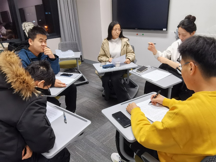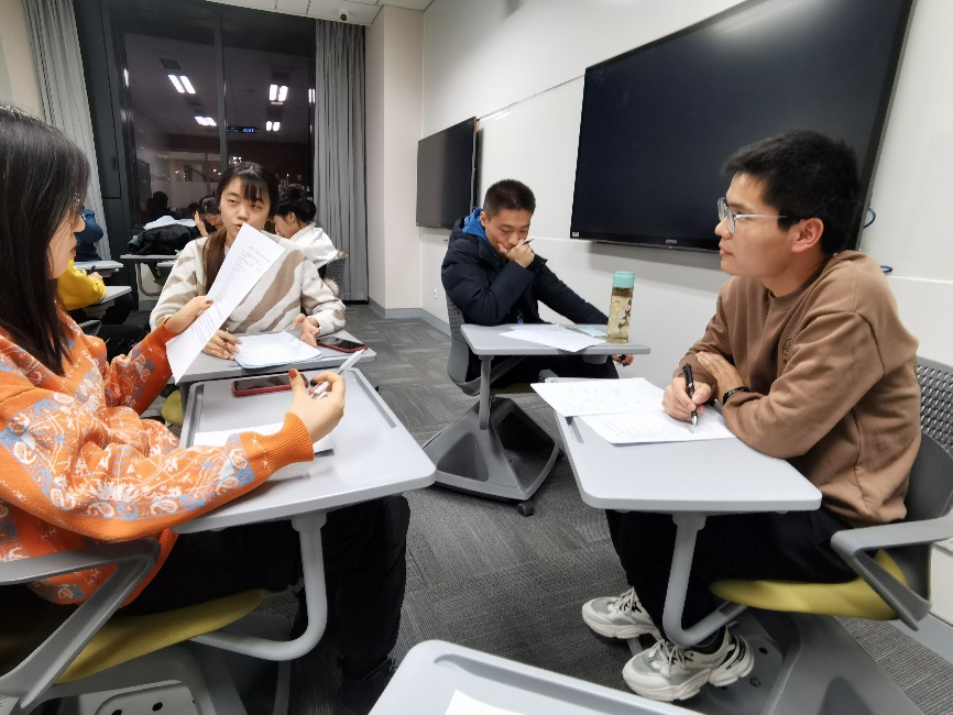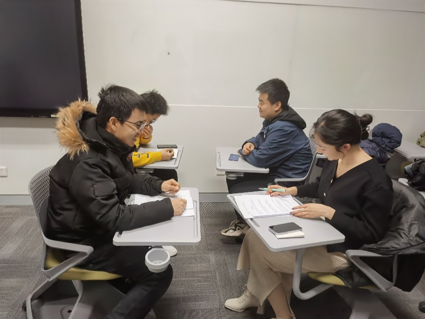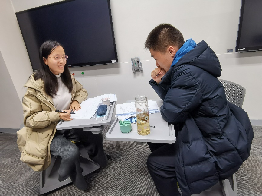 在结构化面试环节中,所有参与者根据支部的提前安排两两分组,分别充当面试官和应聘者按照结构化面试的题本进行模拟提问,然后交换身份互相考查。同学们都针对相关问题进行了细致、全面的思考,并在答题过程中表现出了良好的精神状态和清晰的答题逻辑。作答结束后,组内两位同学针对彼此的面试表现进行点评,从而使大家能够更好地认识到自己在面试过程中的优点和不足。