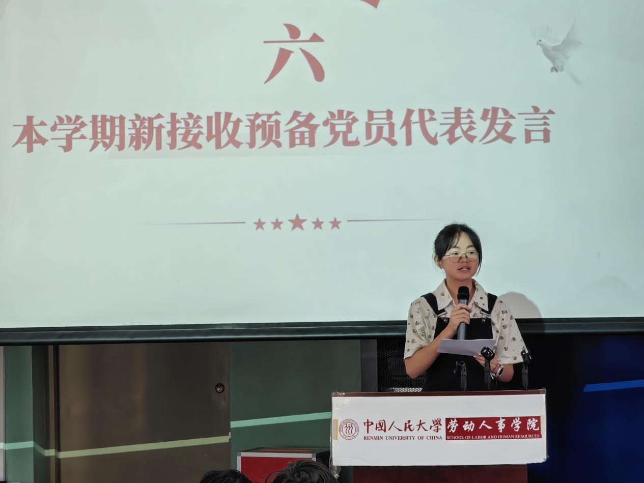 陈琦玥同志首先作为新接收预备党员代表发言,分享自己的入党历程与大学期间的成长历练,深情诉说预备党员们在党组织的关怀下信仰不断坚定的过程,代表全体预备党员做出牢记初心和使命,用实际行动诠释忠诚与担当的庄重承诺。