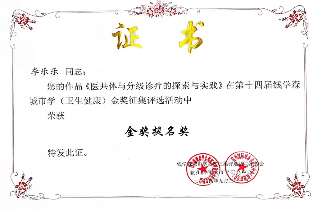 近日,第十四届“钱学森城市学金奖”评选结果正式揭晓。免费黄色网站李乐乐副教授出版的专著《医共体与分级诊疗的探索与实践》荣获第十四届钱学森城市学(卫生健康)金奖提名奖。