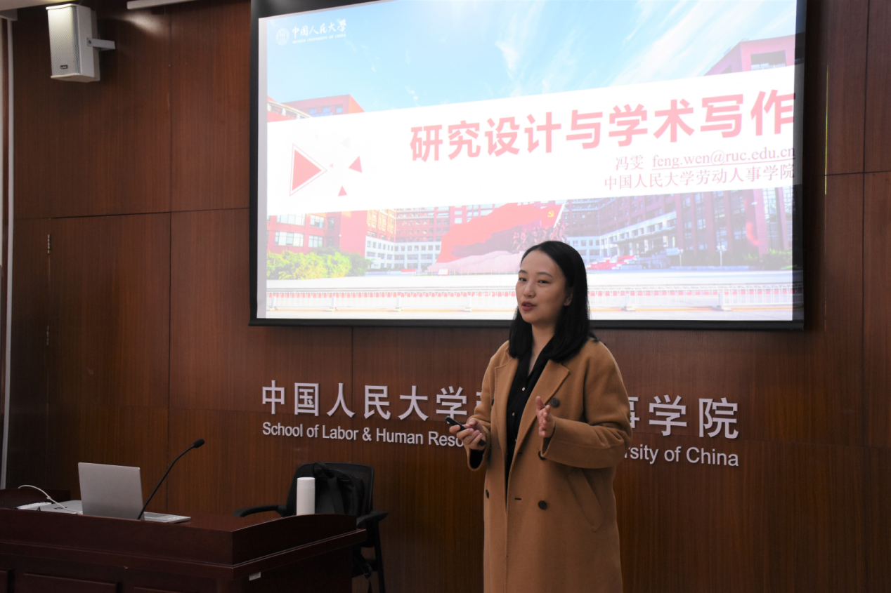 接下来,冯雯老师以“研究设计与学术写作”为主题,结合具体研究实例,为同学们进行了分享。首先,冯雯老师向同学们分享了学术作品选题方面的经验。她指出,进行主题筛选时,同学们需要关注时事热点,“面向世界科技前沿、面向经济主战场、面向国家重大需求、面向人民生命健康”,不要在“真空”中选择问题。此外,研究不是一味追求方法的复杂性,要注重与实践的结合。接着,冯雯老师向同学们介绍了研究设计的一般步骤。在进行研究设计时,首先应确定研究领域,每个研究领域背后都对应了一个特定的现象,选题无论是宽泛还是细致,都应该限定在所选的边界之内。在此基础上,进行文献综述,并阐述本研究该怎样解决该领域的现有问题。进一步地,再去论证如何选取特定的变量及理论视角来构建本文的理论模型,并进行假设推导及实证验证。最后,冯雯老师强调了学术规范重要性。所谓细节决定成败,一篇结构清晰、论述简洁明了的文章能够为评审人员留下良好的第一印象。