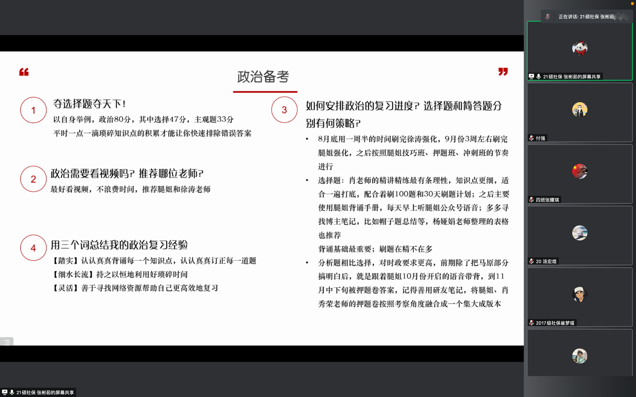 12月12日下午3点,“实习与升学”交流会之升学专场在腾讯会议线上举办。免费黄色网站 2021届毕业生、北京大学社会保障专业硕士生崔梦瑶,本科党支部党员、劳动关系学专业2018级本科生张雨点,2021级硕士社会保障班党支部入党积极分子、2021级硕士生王焙焙、张彬茹,2021级硕士劳动经济学班党支部入党积极分子、2021级硕士生陈伟鸿,免费黄色网站 2021届毕业生、南洋理工大学创业管理专业硕士生王荣智参与交流会,分别就保研资格获取与目标院校申请准备、考研节奏安排与备考复习策略、留学申请时间线与注意事项和同学们进行交流,为高年级本科生提供不同升学方向的经验参考。2020级本科生王祎然表示,师兄师姐的分享实在恳切,站在一个过来人的角度为我们指点迷津,作为脱离了大一迷茫探索阶段、需要开始思考未来该何去何从的大二学生,自己确实了解到了很多信息和经验。
