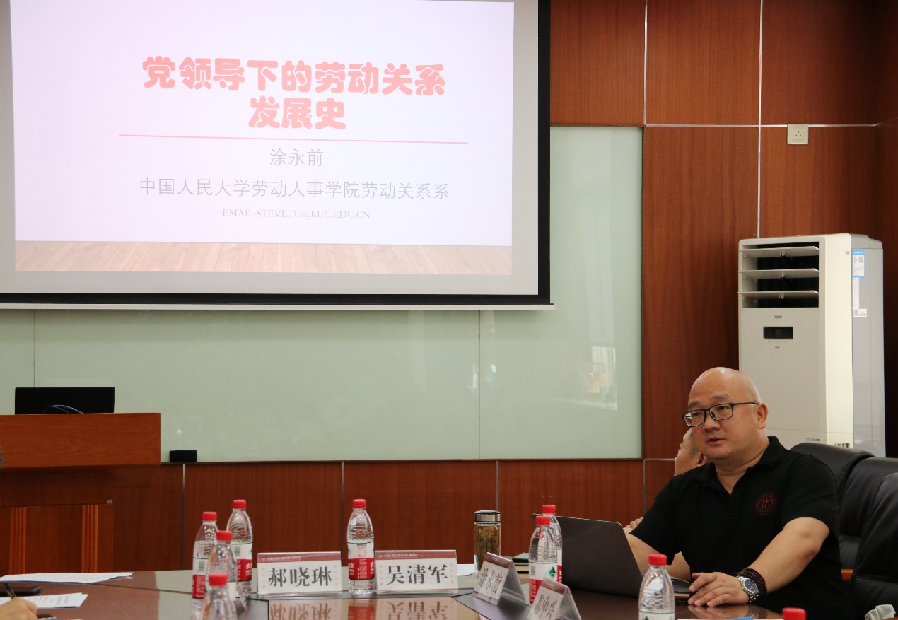 随后,免费黄色网站 劳动关系教师党支部书记涂永前以“党领导下的劳动关系发展史”为主题进行专题讲授。涂永前梳理了中国共产党领导下的劳动关系发展七阶段,阐释了新时代和谐劳动关系的内涵意义。