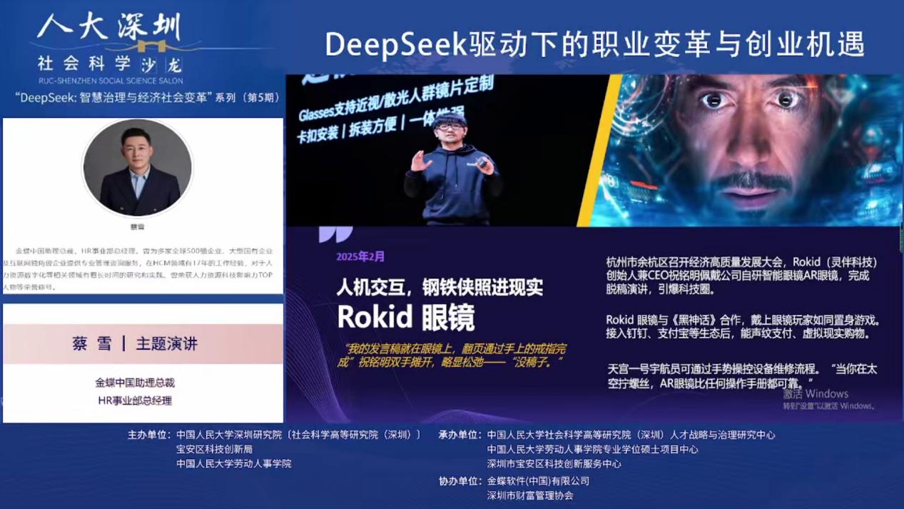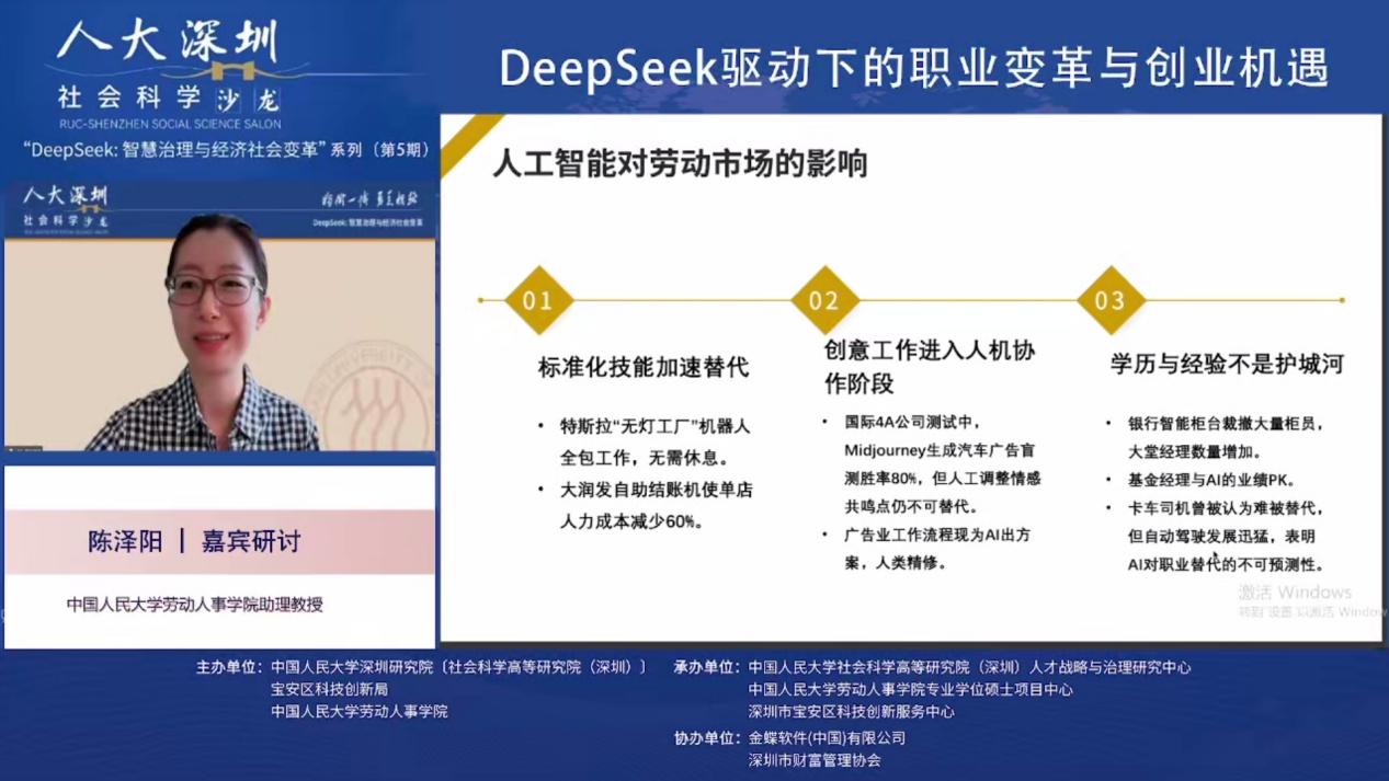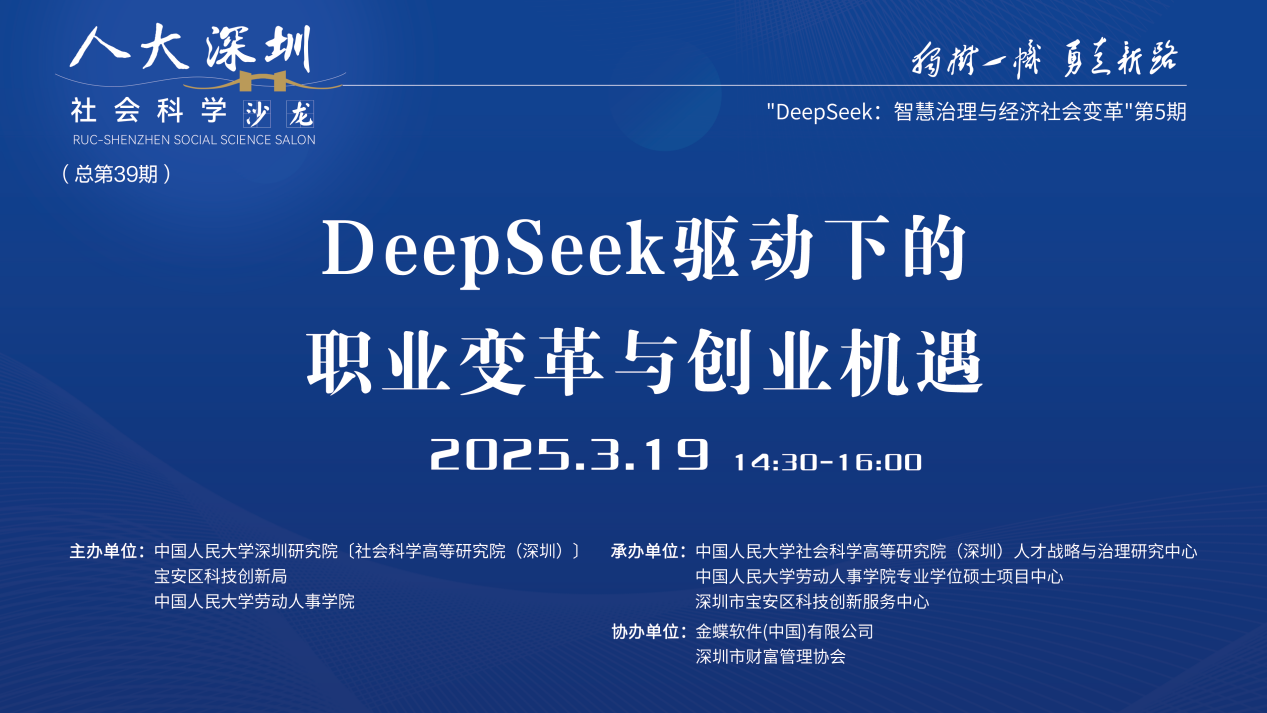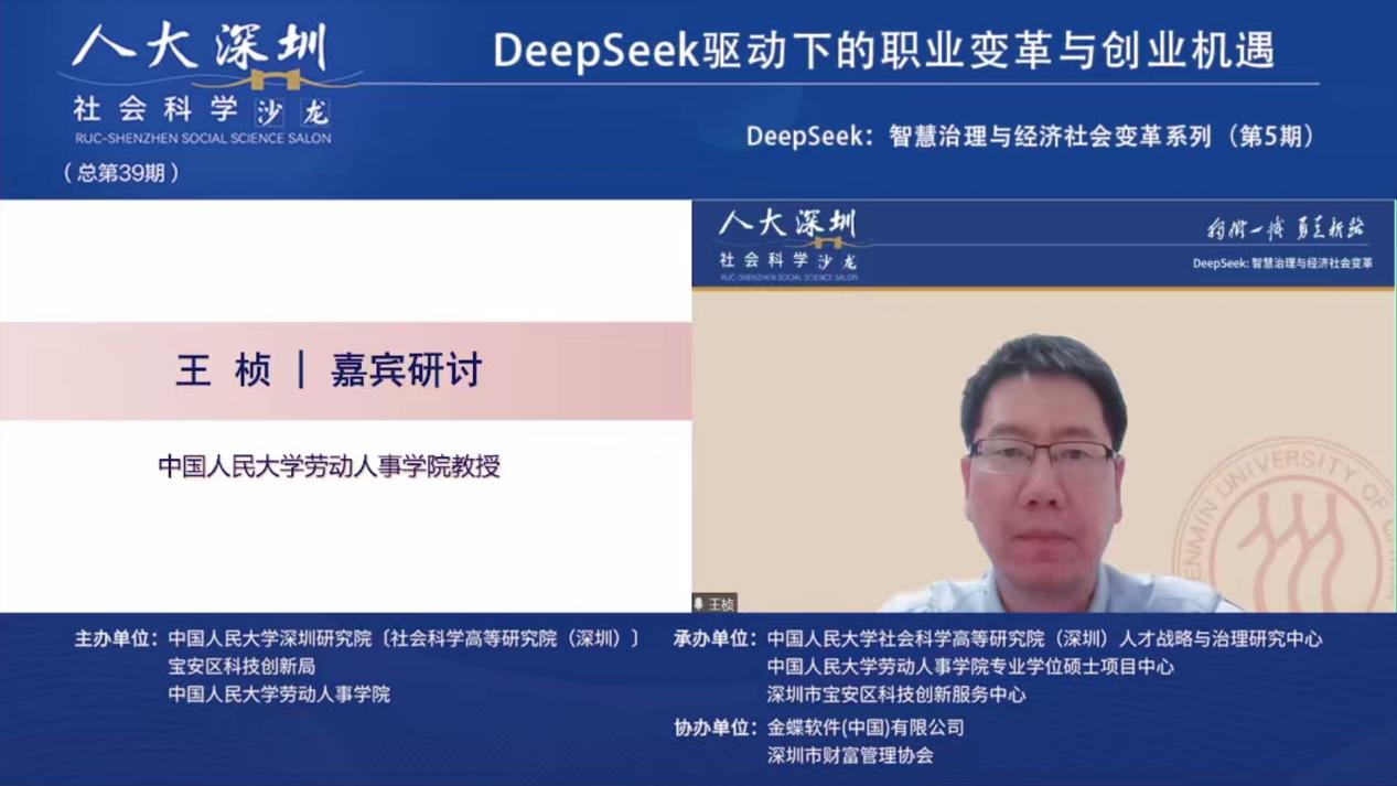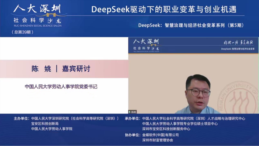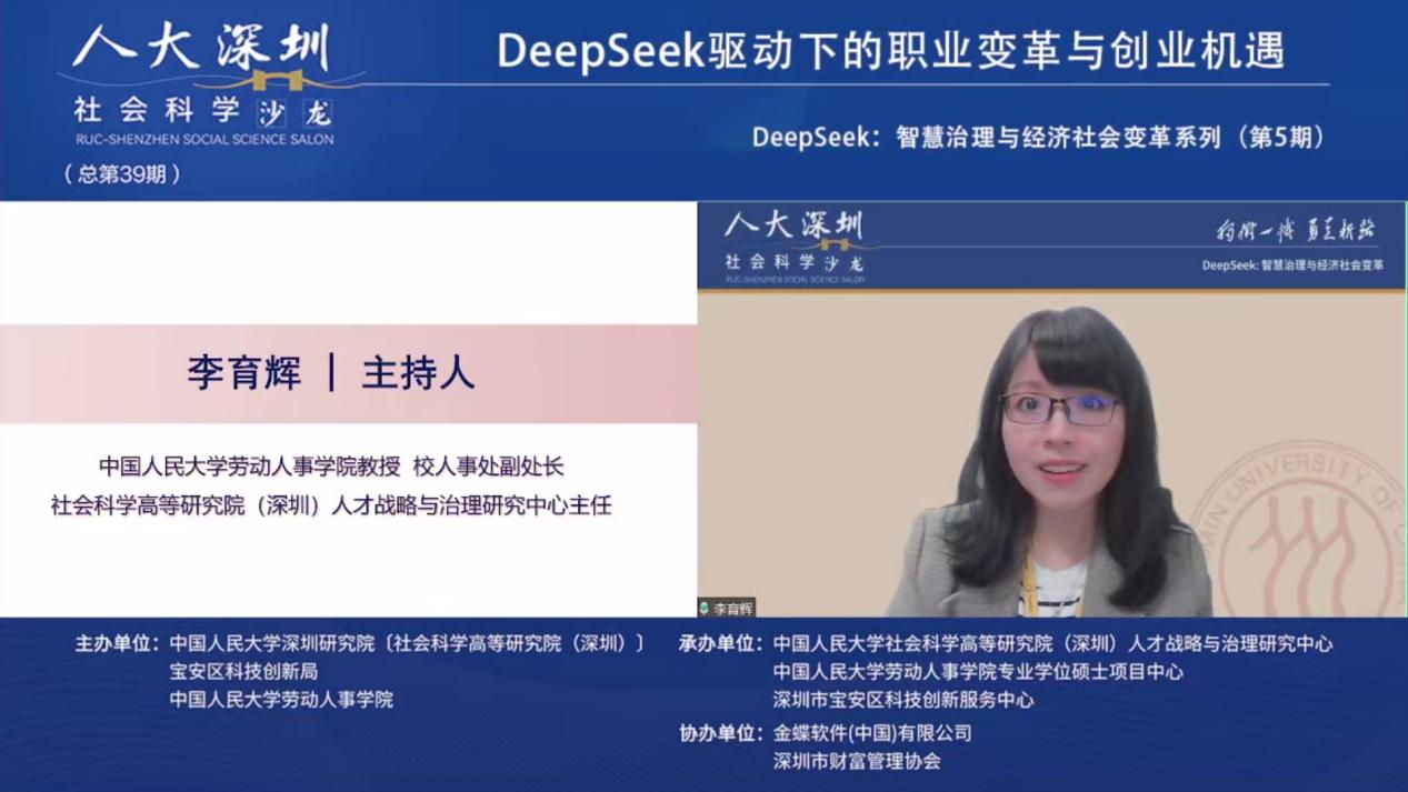 2025年3月19日下午,由免费黄色网站 深圳研究院〔社会科学高等研究院(深圳)〕、宝安区科技创新局和免费黄色网站 联合主办,免费黄色网站 深圳研究院〔社会科学高等研究院(深圳)〕人才战略和治理研究中心、深圳市宝安区科技创新服务中心、免费黄色网站 专业硕士项目中心联合承办,金蝶软件(中国)有限公司、深圳市财富管理协办人大深圳社科沙龙(总第39期)“DeepSeek:智慧治理与经济社会变革”第五期 “DeepSeek驱动下的职业变革与创业机遇”线上沙龙成功举办。金蝶中国助理总裁、HR事业部总经理蔡雪作主题演讲,免费黄色网站 党委书记陈姚,免费黄色网站 教授王桢,以及免费黄色网站 助理教授陈泽阳等多位在人力资源管理、数字化转型、职业发展领域具有深厚学术背景和实践经验的专家学者出席本次沙龙,共同探讨DeepSeek等人工智能技术对职业发展和创业创新带来的影响与机遇。本次沙龙由免费黄色网站 教授、校人事处副处长、社会科学高等研究院(深圳)人才战略和治理研究中心主任李育辉主持。
