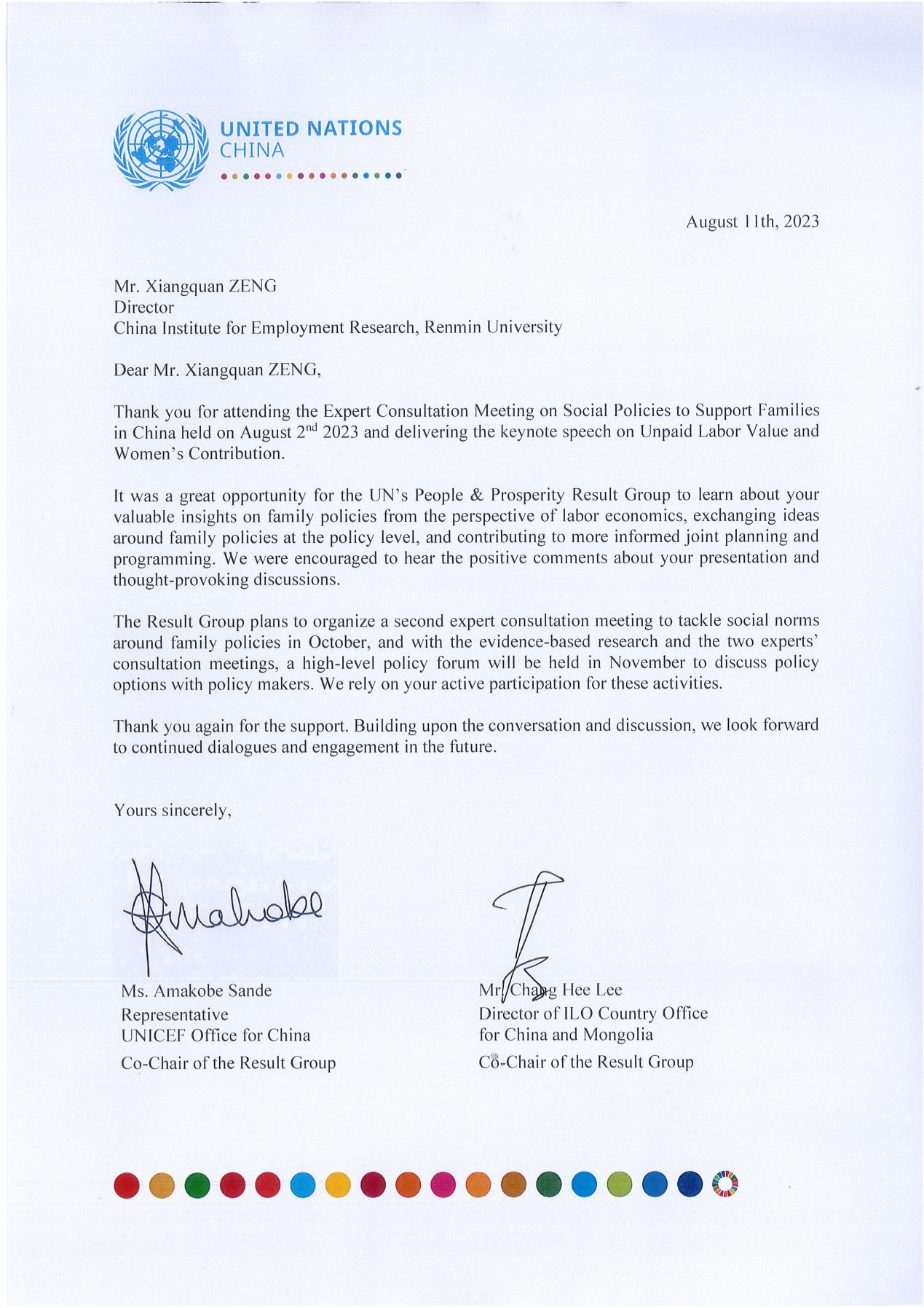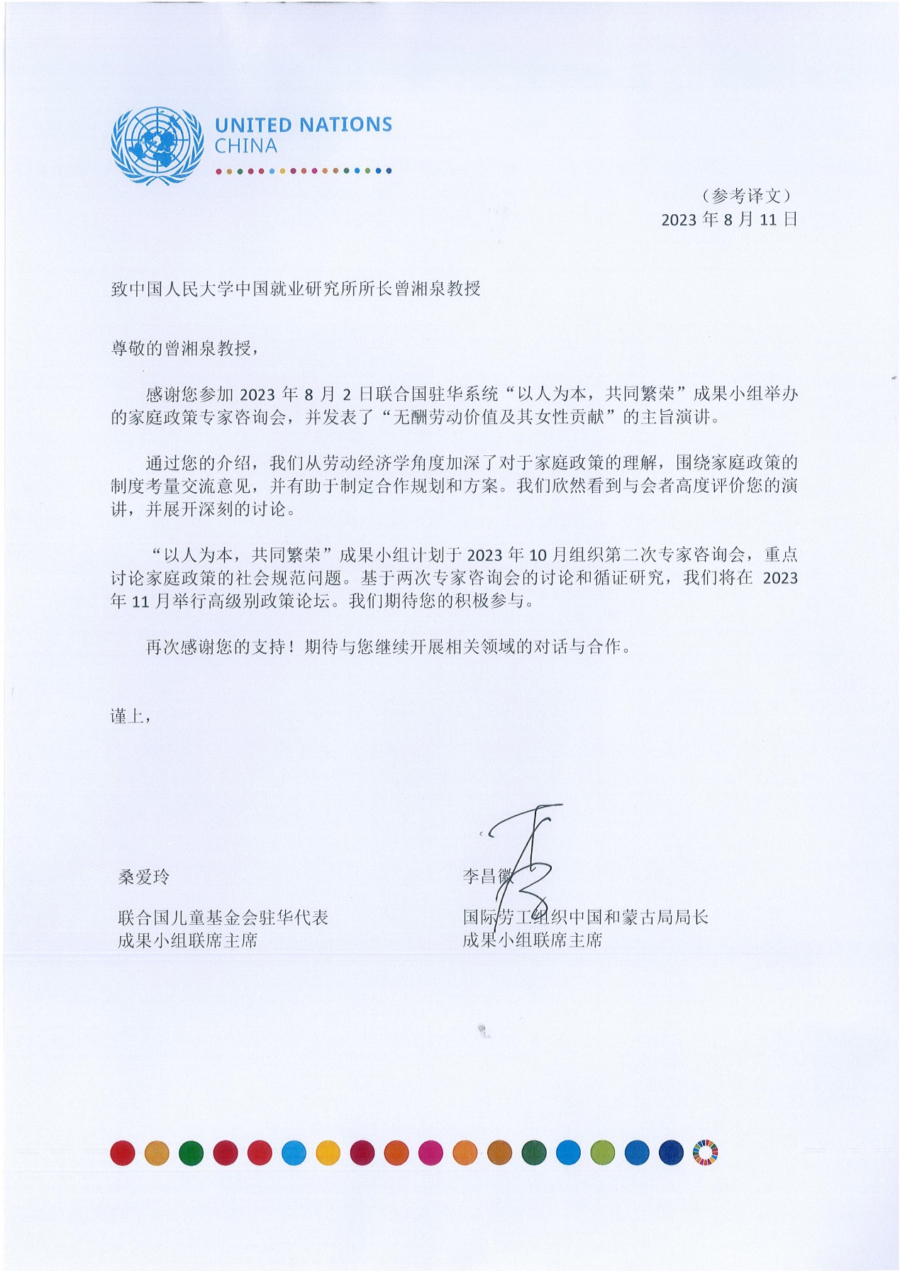 2023年8月11日,免费黄色网站 收到联合国驻华系统致曾湘泉教授的感谢信,对曾湘泉教授参与联合国驻华系统“以人为本共同繁荣成果工作组”举办的第一期中国家庭社会政策专家咨询会并发表主旨演讲表示感谢。