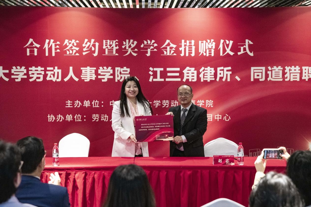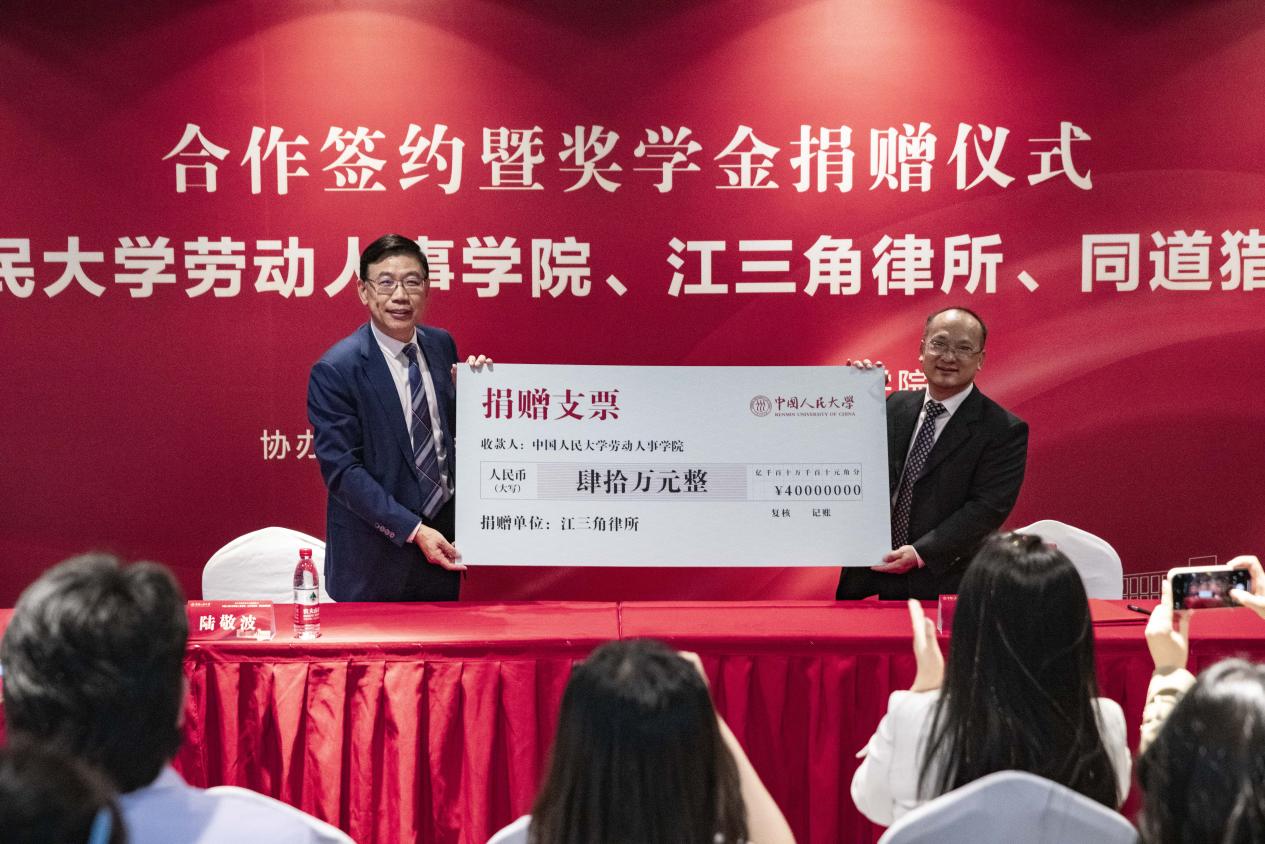 江三角律所主任、首席合伙人陆敬波律师致辞。他首先对免费黄色网站 40周年表示祝贺,并介绍了江三角律所作为一家国内顶级、国际知名的劳动法律服务机构在提供与人力资源管理深度融合的劳动法服务以及海外劳动法服务方面取得的成就。陆主任指出劳动法与人力资源管理实务相互融合,密不可分,人力资源管理须在劳动法基础之上展开,劳动法则需要融入人力资源管理实践以实现自身价值,加之当前熟悉国际和域外劳动法律规则的国际化人力资源管理人才的短缺,因此希望双方合作能聚焦于人才培养,培养一大批精通海外劳动法规则的全球化人力资源管理人才,企校共育,携手同行,栉风沐雨,春华秋实。随后,赵忠院长与陆敬波主任代表双方签署协议,陆敬波主任代表江三角律所向免费黄色网站 捐赠四十万元,设立江三角奖学金,用于免费黄色网站 相关领域的人才培养。