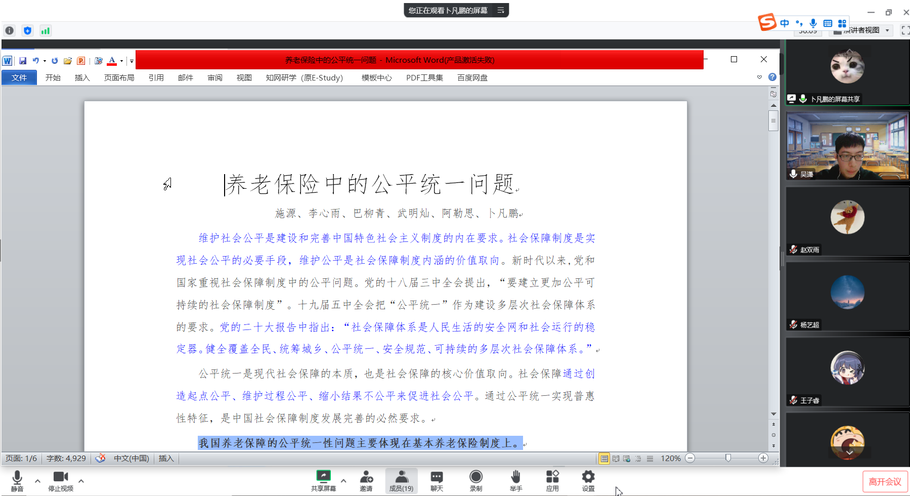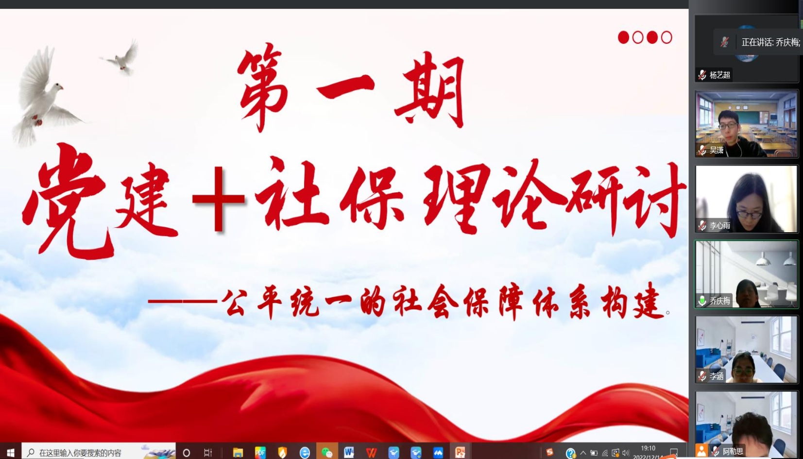 为了贯彻落实党的二十大精神及习近平总书记在考察免费黄色网站 时重要讲话精神,时刻做到“坚持问题导向”、“增强问题意识”“不断研究新情况,总结新经验,解决新问题”,2022级硕士社会保障班党支部于12月14日晚在线上顺利举办第一期“党建+社保理论研讨”活动。本次研讨以公平统一的社会保障体系构建为主题,分析我国社会保障公平统一问题的现状、成因及对策,旨在通过研讨党和人民关切的社会保障问题,提升支部的党性修养与专业素养,强化支部建设,筑牢坚强战斗堡垒。活动由支部书记吴潇主持,免费黄色网站 副教授、2022级硕士社会保障班主任乔庆梅受邀参与研讨。