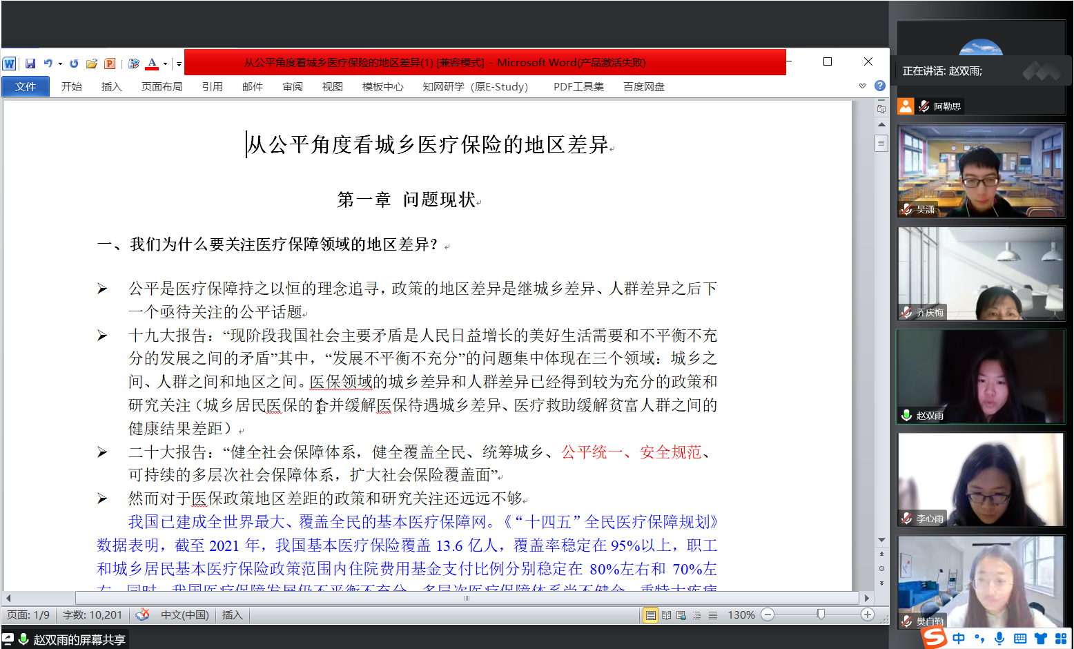之后,医疗保障研讨小组、养老保障研讨小组、残疾人保障研讨小组结合本学期的科研经历,依次进行成果汇报与组间讨论。医疗保障研讨小组以我国城乡医疗保险政策为例,从人均医疗费用、起付线、医疗服务利用等角度阐述了地区间不公平问题的现状,并从我国政府多层级治理结构、地方政府财政依赖、地区资源禀赋及地方行政官员治理能力的视角阐述了上述不公平现象的成因。养老保障小组、残疾人保障小组分别就“基本养老保险制度设计上存在地区、职业、代际、性别层面的差异性”、“残疾、贫困与收入分配公平”展开汇报,分析了我国城镇职工养老保险制度公平问题的现状、成因、对策及促进残疾人群体实现共同富裕的着力点。
