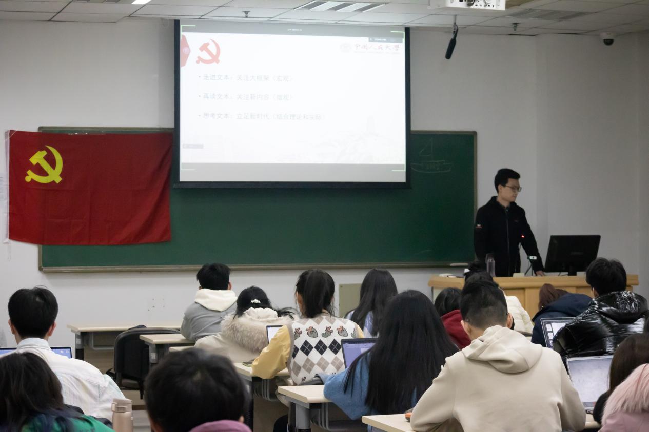 3月18日,本科第一党支部在明德主楼0304举行了“立足新时代的总结和动员——共同学习十九届六中全会精神”主题党日活动。本次活动邀请到免费黄色网站 马克思主义免费黄色网站 博士生宣讲团讲师于锦洋同志分享党课专题。在宣讲中,于锦洋从“走进文本”、“再读文本”、“思考文本”三个层次为同志们解读了《中共中央关于党的百年奋斗成就和历史经验的决议》和十九届六中全会精神。随后,党支部书记付强就学校第十五次党代会和支部建言献策工作情况作了进一步说明。
