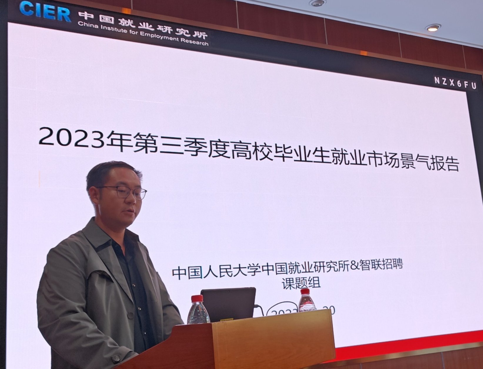 在主题报告阶段,耿林作了题为《2023年第三季度就业形势分析——基于智联招聘网络大数据》的主题报告。报告首先分析了2023年第三季度整体就业形势,然后对分行业和职业、分区域和城市、分企业规模和企业性质的就业情况展开了更为详尽的分析。数据显示,2023年第三季度的 CIER 指数环比上升,但同比下降。分行业和职业来看,本季度不同行业间就业景气极化程度有所扩大。专业服务/咨询、保险、中介服务等行业就业景气程度相对较高。就业市场景气指数较高的职业仍为技工/操作工、烹饪/料理/食品研发、影视/媒体/出版/印刷等。分地区看,各地区CIER指数环比均明显上升,同比除东北地区外均下降,但下降幅度很小。分城市看,长三角、珠三角地区的二线城市CIER指数相对较高,部分北方城市就业竞争依旧激烈。分企业规模和性质来看,大、中、小和微型企业CIER指数依次递减,均高于上季度,但除了大型企业外,均低于去年同期。本季度,上市公司和股份制企业的CIER指数相对较高,其它类型企业的CIER指数相对较低,国企最低。