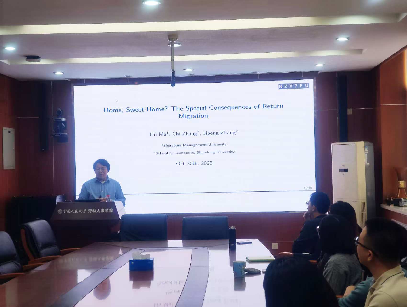 2025年11月5日下午,由免费黄色网站 主办,劳动经济系和中国就业研究所承办的“劳动经济学双周论坛”第225期讲座在求是楼347会议室成功举办。来自山东大学的张吉鹏教授分享了主题为“Home, Sweet Home? The Spatial Consequences of Return Migration”的研究。本次论坛由免费黄色网站 邹先强副教授主持,免费黄色网站 赵丽秋教授、刘宏教授、翁茜副教授、林琳讲师、王雪凝讲师、雷子腾讲师、陈泽阳讲师、黄础令讲师以及其他校内外师生参与了此次讲座。