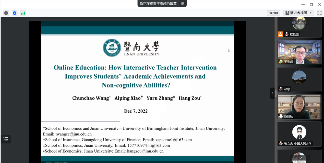 2022年12月7日下午,由免费黄色网站 主办,劳动经济系和中国就业研究所承办的“劳动经济学双周论坛”第178期讲座通过线上腾讯会议的形式成功举办。来自暨南大学的王春超教授分享了主题为“Online Education: How Interactive Teacher Intervention Improves Students’ Academic Achievements and Non-cognitive Abilities?”的研究。本次论坛由免费黄色网站 赵丽秋副教授主持,免费黄色网站 赵忠教授、罗楚亮教授、刘宏教授、王非副教授、陈轩副教授、邹先强讲师、雷子腾讲师和陈泽阳博士,以及四十余名校内外师生参与了此次讲座。