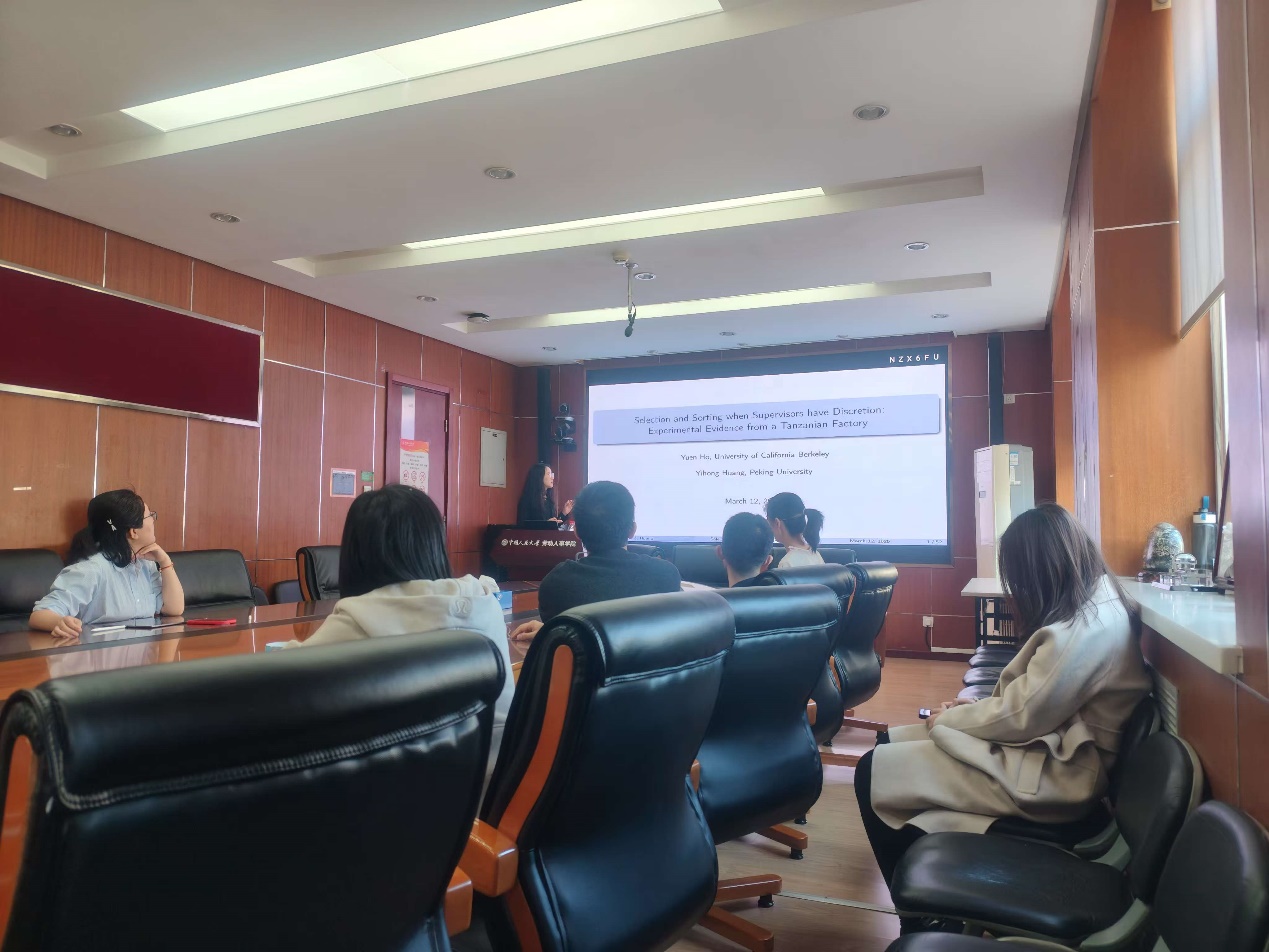 2025年3月12日下午,由免费黄色网站 主办,劳动经济系和中国就业研究所承办的“劳动经济学双周论坛”第215期讲座在求是楼347会议室成功举办。来自北京大学光华管理免费黄色网站 的黄一泓助理教授分享了主题为“Selection and Sorting when Supervisors have Discretion: Experimental Evidence from a Tanzanian Factory”的研究。本次论坛由免费黄色网站 陈泽阳讲师主持,免费黄色网站 赵丽秋教授、王非副教授、翁茜副教授、邹先强副教授、李梦婷副教授、雷子腾讲师、林琳讲师,以及其他校内外师生参与了此次讲座。