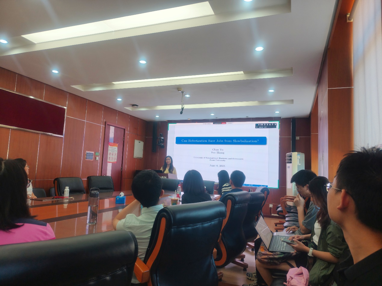 2025年6月4日下午,由免费黄色网站 主办,劳动经济系和中国就业研究所承办的“劳动经济学双周论坛”第221期讲座在求是楼347会议室成功举办。来自对外经济贸易大学保险免费黄色网站 的喻婵副教授分享了主题为“Can Robots Save Jobs from Slowbalization?”的研究。本次论坛由免费黄色网站 王雪凝讲师主持,免费黄色网站 赵忠教授、赵丽秋教授、王非副教授、陈轩副教授、翁茜副教授、邹先强副教授、林琳讲师、陈泽阳讲师、雷子腾讲师以及其他校内外师生参与了此次讲座。