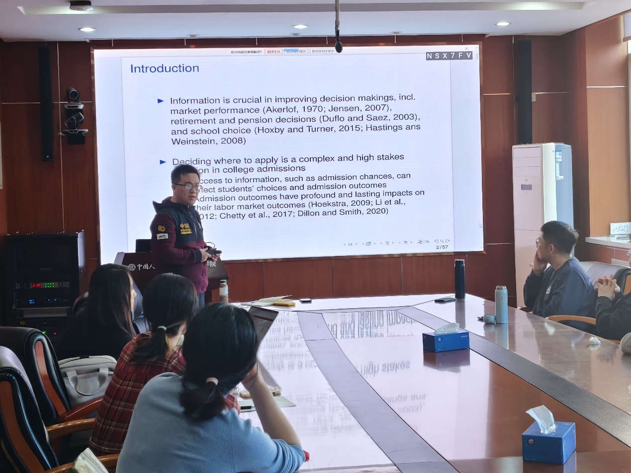 2024年12月5日下午,由免费黄色网站 主办,劳动经济系和中国就业研究所承办的“劳动经济学双周论坛”第214期讲座在求是楼347会议室成功举办。来自南京大学教育研究院康乐特任副研究员分享了主题为“Information Asymmetries in College Admissions”的研究。本次论坛由免费黄色网站 王非副教授主持,免费黄色网站 邹先强副教授、林琳讲师、雷子腾讲师、王雪凝讲师、陈泽阳讲师,以及其他校内外师生参与了此次讲座。