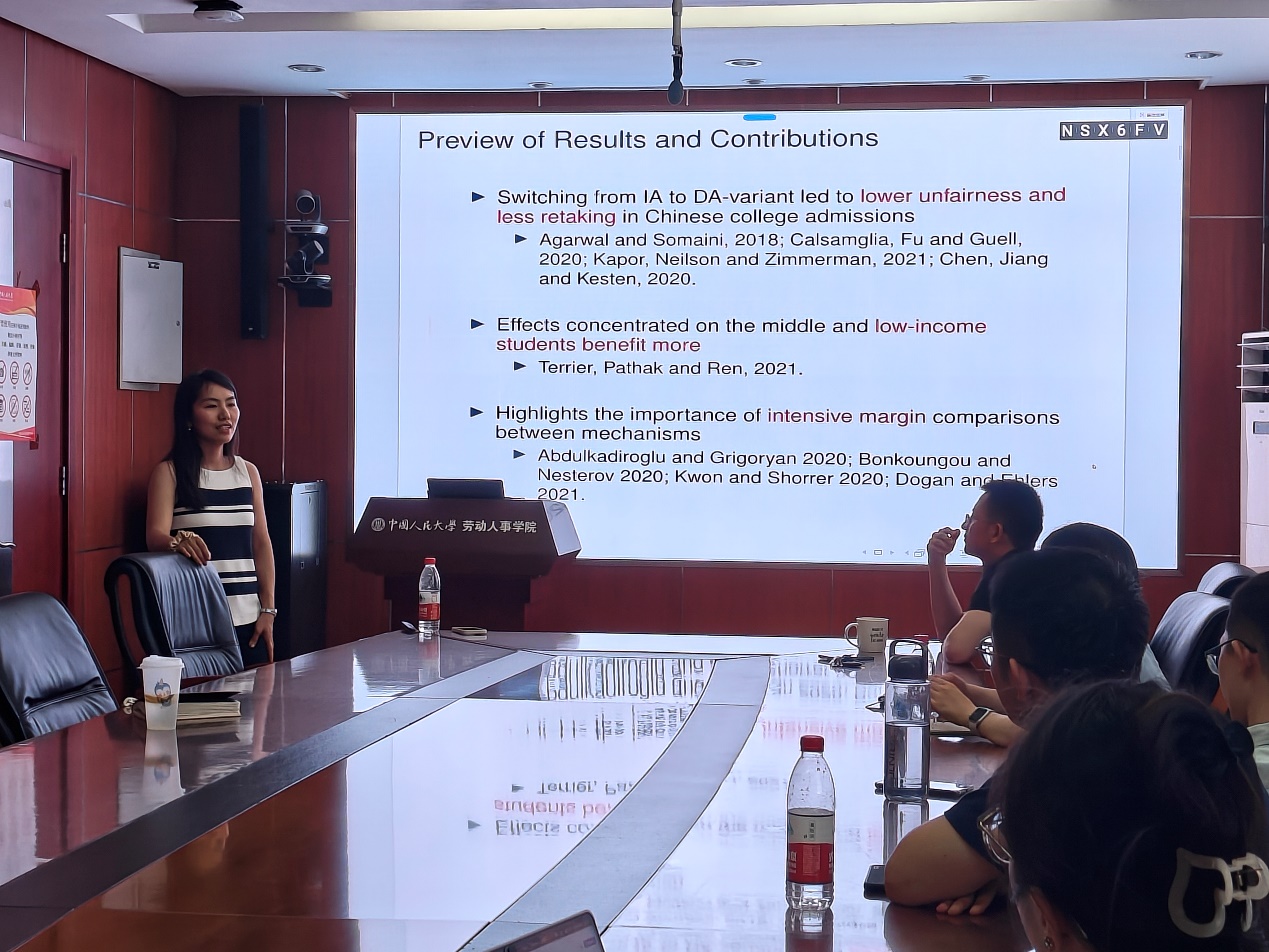在讲座过程中以及讨论环节,参会师生就个人偏好同质性假设、公正的嫉妒(justified envy)的测度、复读生对结果造成的可能影响、贫困县招生政策倾斜的影响、不同学校填报平行志愿数量的差异、填报志愿时对专业选择的考虑、匹配机制中学校层面对学生录取的偏好等问题进行了探讨。最后,参会师生对宋阳老师的精彩分享表示由衷的感谢。