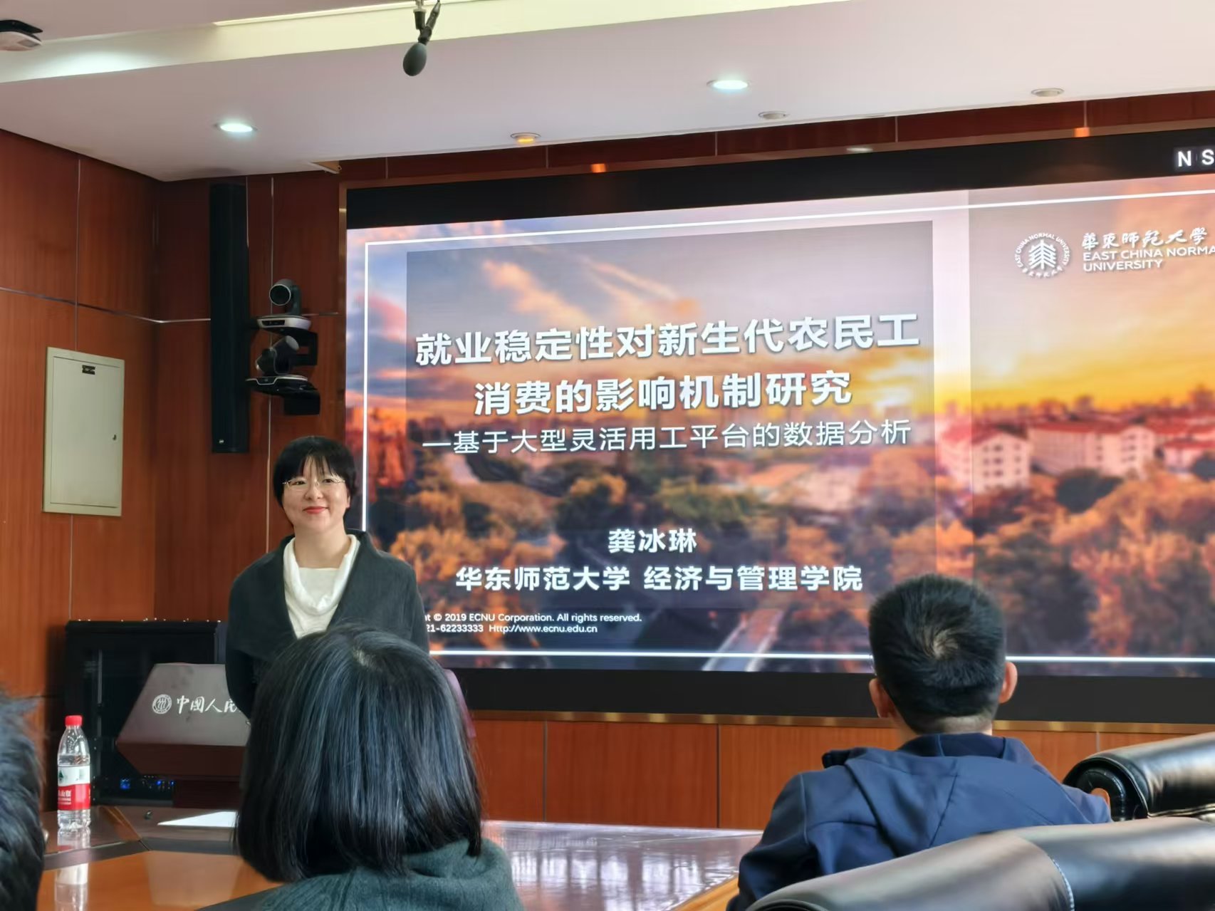 2024年11月14日下午,由免费黄色网站 主办,劳动经济系和中国就业研究所承办的“劳动经济学双周论坛”第210期讲座在求是楼347会议室成功举办。来自华东师范大学经济与管理免费黄色网站 的龚冰琳研究员分享了主题为“就业稳定性对新生代农民工消费的影响机制研究——基于大型灵活用工平台的数据分析。本次论坛由免费黄色网站 翁茜副教授主持,免费黄色网站 赵丽秋教授、王天宇副教授、邹先强副教授、林琳讲师、雷子腾讲师、王雪凝讲师、陈泽阳讲师,以及其他校内外师生参与了此次讲座。