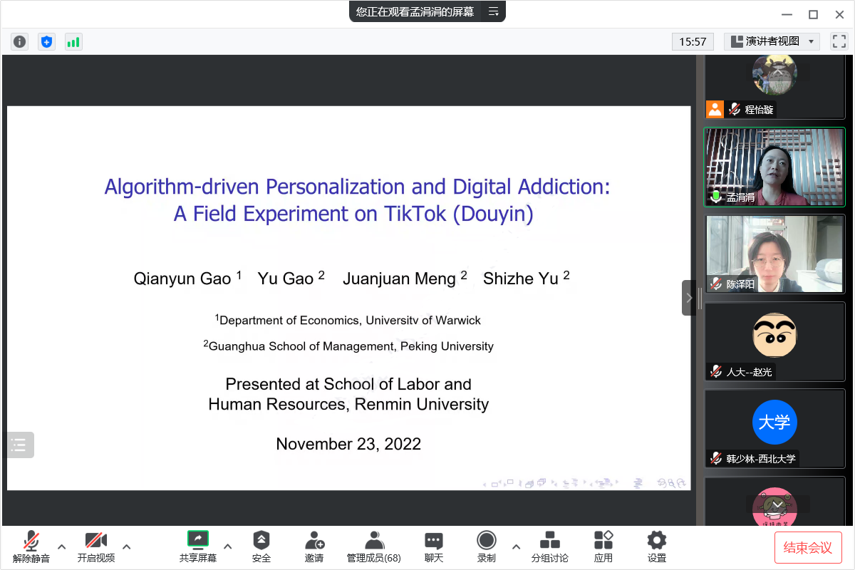 2022年11月23日下午,由免费黄色网站 主办,劳动经济系和中国就业研究所承办的“劳动经济学双周论坛”第176期讲座通过线上腾讯会议的形式成功举办。来自北京大学的孟涓涓教授分享了主题为“Algorithm-driven Personalization and Digital Addiction: A Field Experiment on Tiktok (Douyin)”的研究。本次论坛由免费黄色网站 陈泽阳博士主持,免费黄色网站 赵忠教授、罗楚亮教授、韩军副教授、赵丽秋副教授、王非副教授、陈轩副教授、邹先强助理教授、林琳助理教授、雷子腾助理教授和王雪凝助理教授,以及八十余名校内外师生参与了此次讲座。