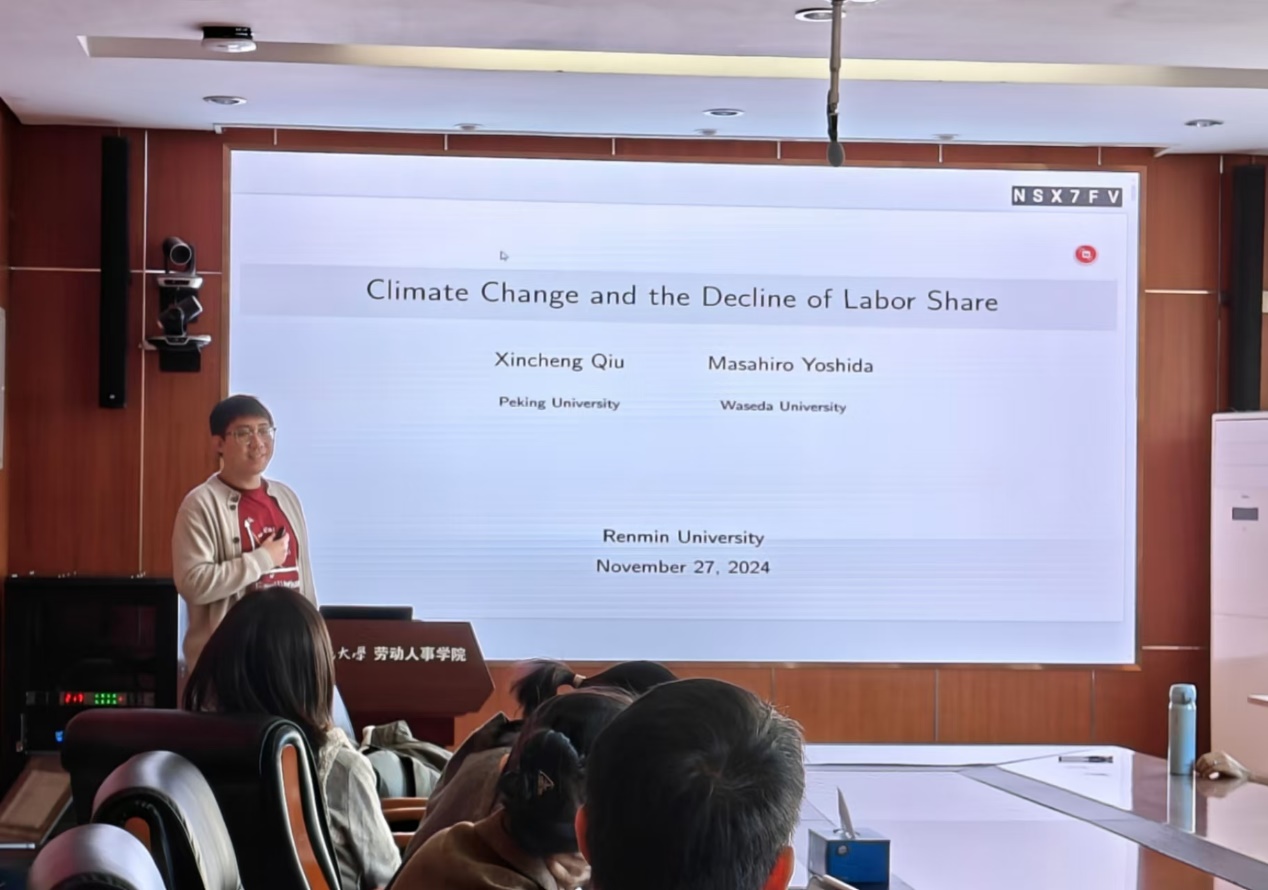 2024年11月27日下午,由免费黄色网站 主办,劳动经济系和中国就业研究所承办的“劳动经济学双周论坛”第212期讲座在求是楼347会议室成功举办。来自北京大学光华管理免费黄色网站 的仇心诚助理教授分享了主题为“Climate Change and the Decline of Labor Share”的研究。本次论坛由免费黄色网站 陈泽阳讲师主持,免费黄色网站 赵丽秋教授、王非副教授、陈轩副教授、邹先强副教授、林琳讲师、雷子腾讲师、王雪凝讲师,以及其他校内外师生参与了此次讲座。