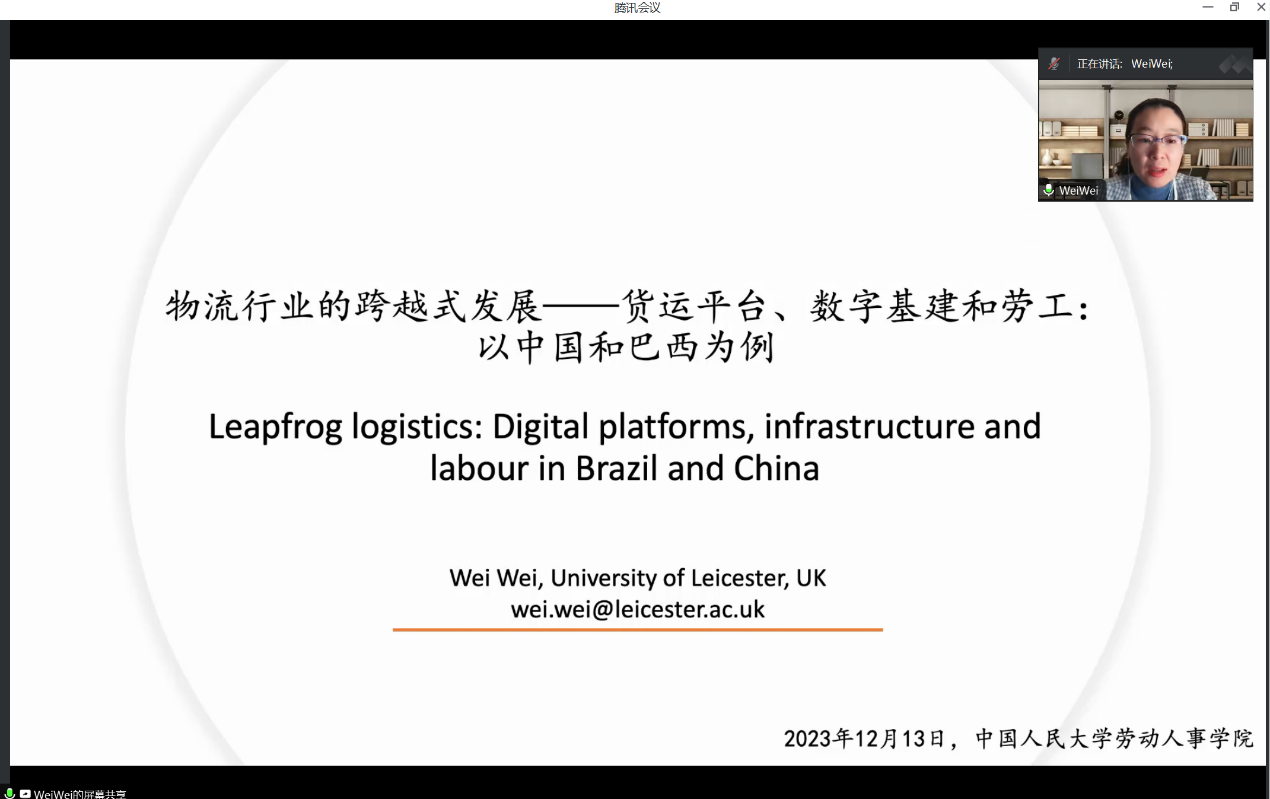 2023年12月13日下午,由免费黄色网站 主办,劳动关系系承办的“劳关天下”免费黄色网站 40周年院庆系列学术讲座暨“劳关天下”系列讲座第二十讲在线上成功举办。来自英国莱斯特大学商免费黄色网站 的讲师魏薇以“Leapfrog logistics: digital trucking platforms, infrastructure, and labor in Brazil and China”为题做了精彩分享,张皓副教授主持了此次讲座,汪建华副教授与20余名校内外师生共同参与了此次讲座。
